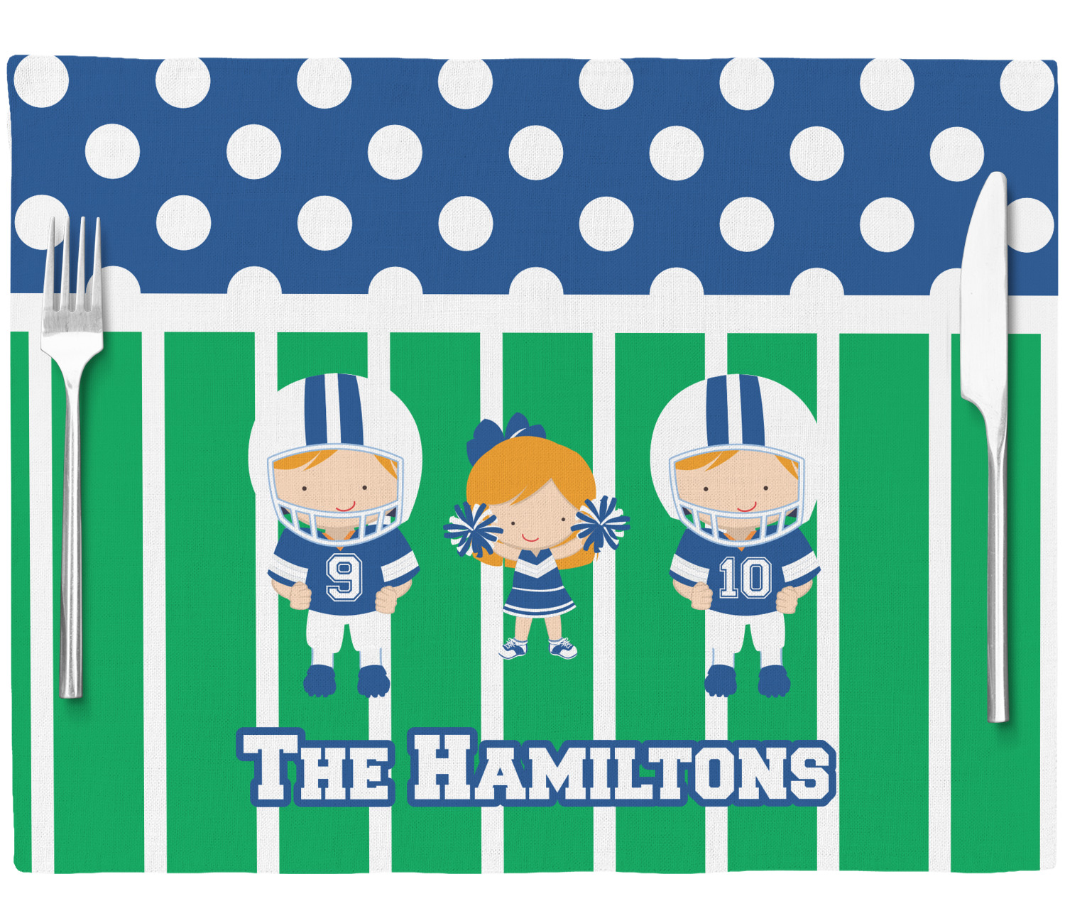 Each of our table mats are a poly twill material with woven burlap detailing. This creates a soft, quality placemat for us to fully print your personalized design across. The woven twill also adds a wrinkle-free surface to set your table! Each customizable placemat is a rectangle shape measuring at approximately 13 x 18 and printed here in the USA.