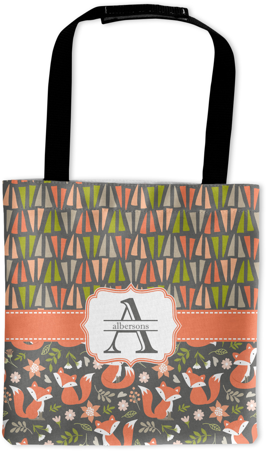 Embrace your inner woodsmen with the Fox Trail Floral design. The bottom of design features an adorable, orange fox surrounded by flowers and leaves on a gray background. On top of the design, there are abstract triangles in orange, green and gray.
