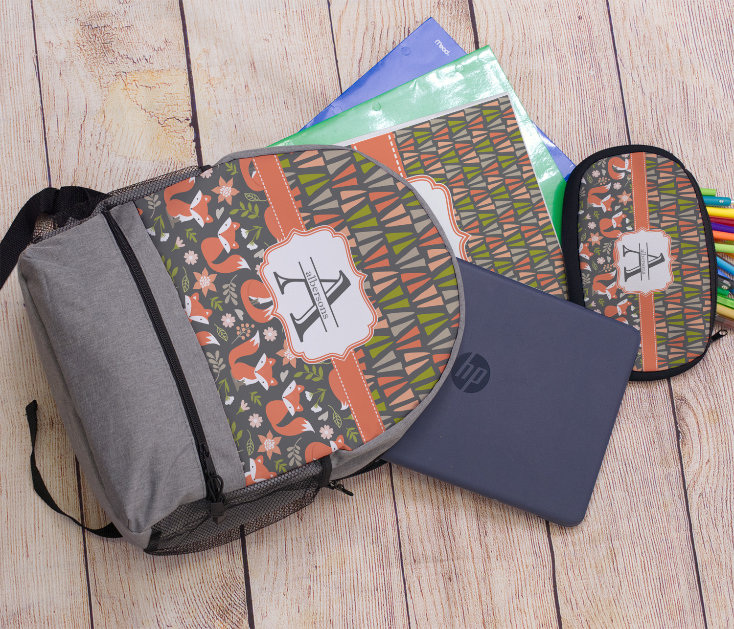 Embrace your inner woodsmen with the Fox Trail Floral design. The bottom of design features an adorable, orange fox surrounded by flowers and leaves on a gray background. On top of the design, there are abstract triangles in orange, green and gray.