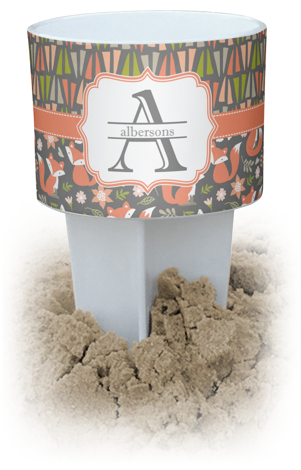 This cup holder has a large stake at its bottom that anchors it to the sand or ground below, while the cup holder rests above the stake. The entire drink holder is made of durable plastic and displays your customization around the cup holder portion. We sell these personalized beach spikers in two different colors: black and white.