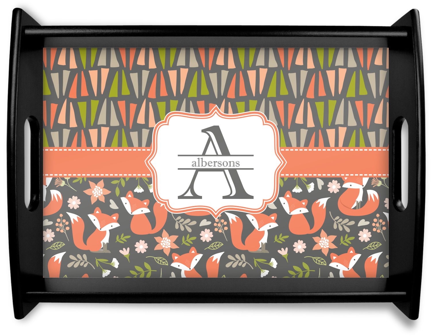 This serving tray with handles features square edges and two rounded sides, creating a very modern look. Each side is fabricated from a beautifully cut, natural wood. The bottom of the interior of the tray displays your customized design in bright, vibrant color. The tray is sold in both a black color and a natural wood look. Each variation of the wood serving tray has two sizes: Small, which is 14" x 10" x 2.25", and Large, which is 19.5" x 13.5" x 2.75".