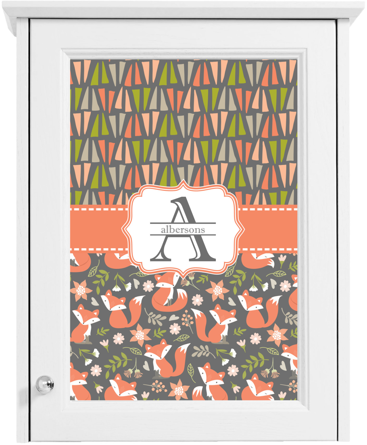 Embrace your inner woodsmen with the Fox Trail Floral design. The bottom of design features an adorable, orange fox surrounded by flowers and leaves on a gray background. On top of the design, there are abstract triangles in orange, green and gray.