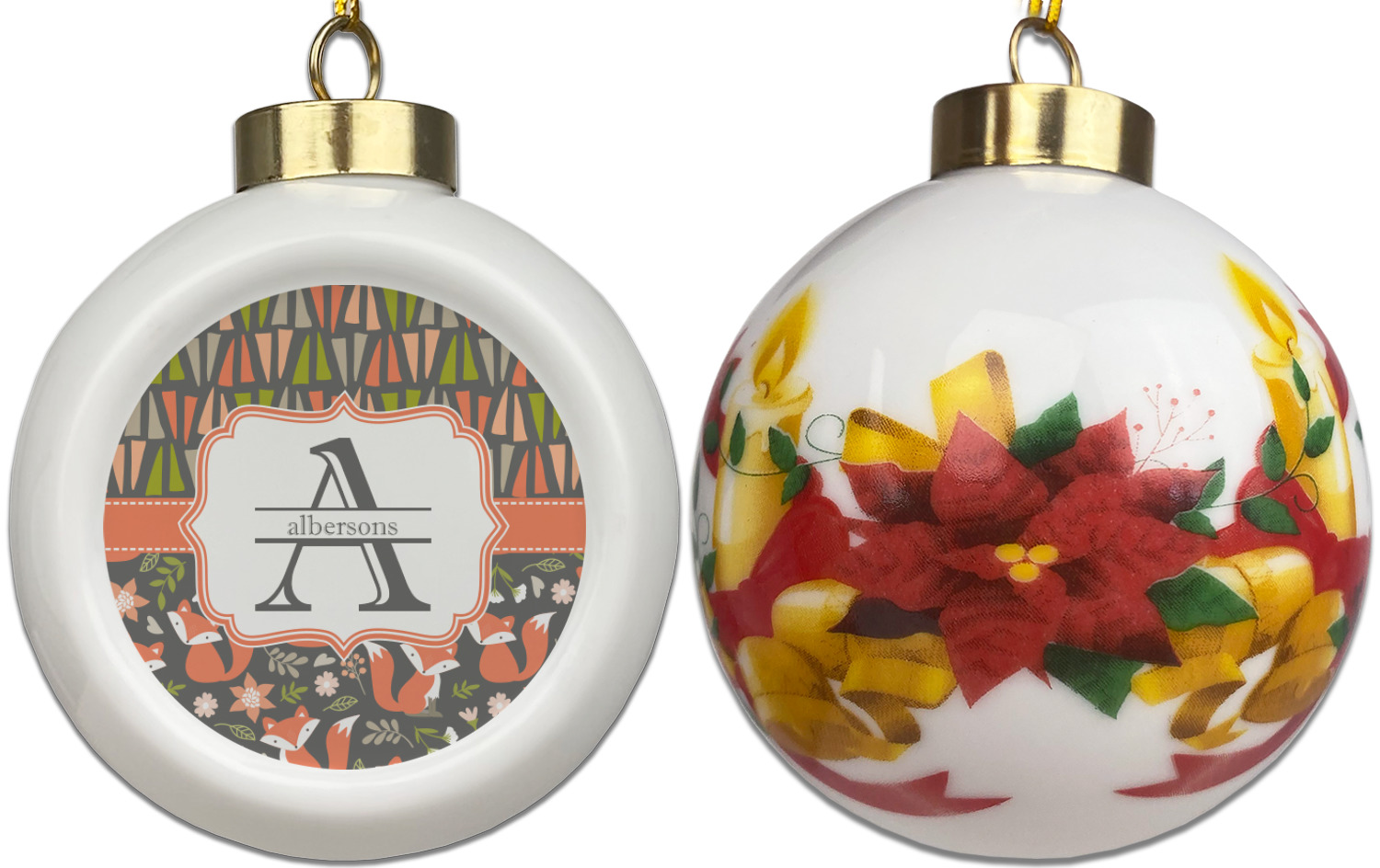 Our Christmas ornaments are a unique ceramic ball shape with a twist as it has a flat face to display your custom design! Select from one of our two design types - Christmas Tree or Poinsettia Garland - to adorn the curved back of your personal design. Each ornament measures 3H x 2.5W x 2D accompanied with a gold string accent for finishing touches to hang on your beautiful Christmas tree!