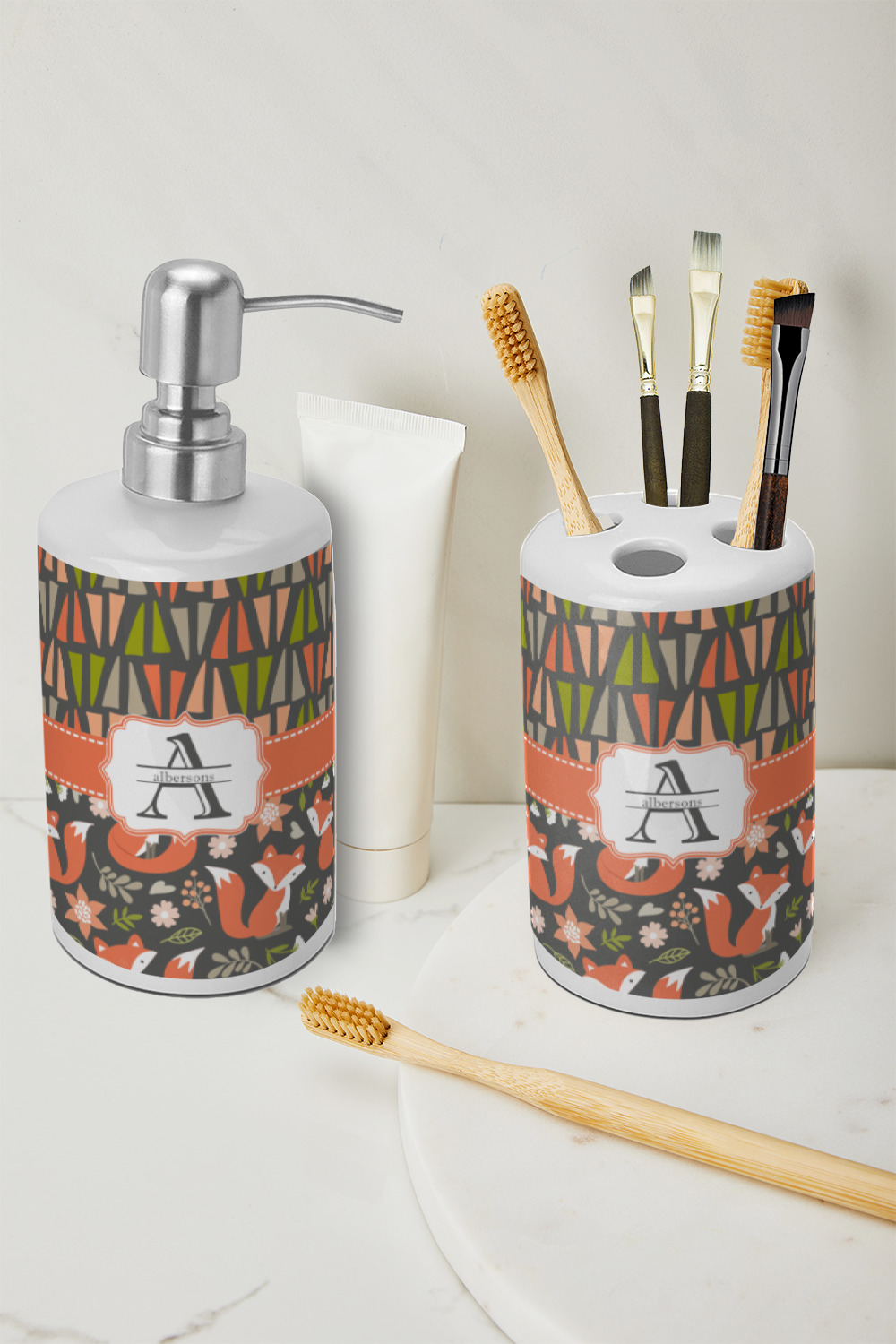 This two piece, ceramic bathroom set will add the perfect splash of color to any bathroom. This set includes one pump dispenser, ideal for soap or lotion, and one toothbrush holder with four holes. Although originally designed for toothbrushes, the holder will also hold make-up brushes, nail files, and other bathroom tools.