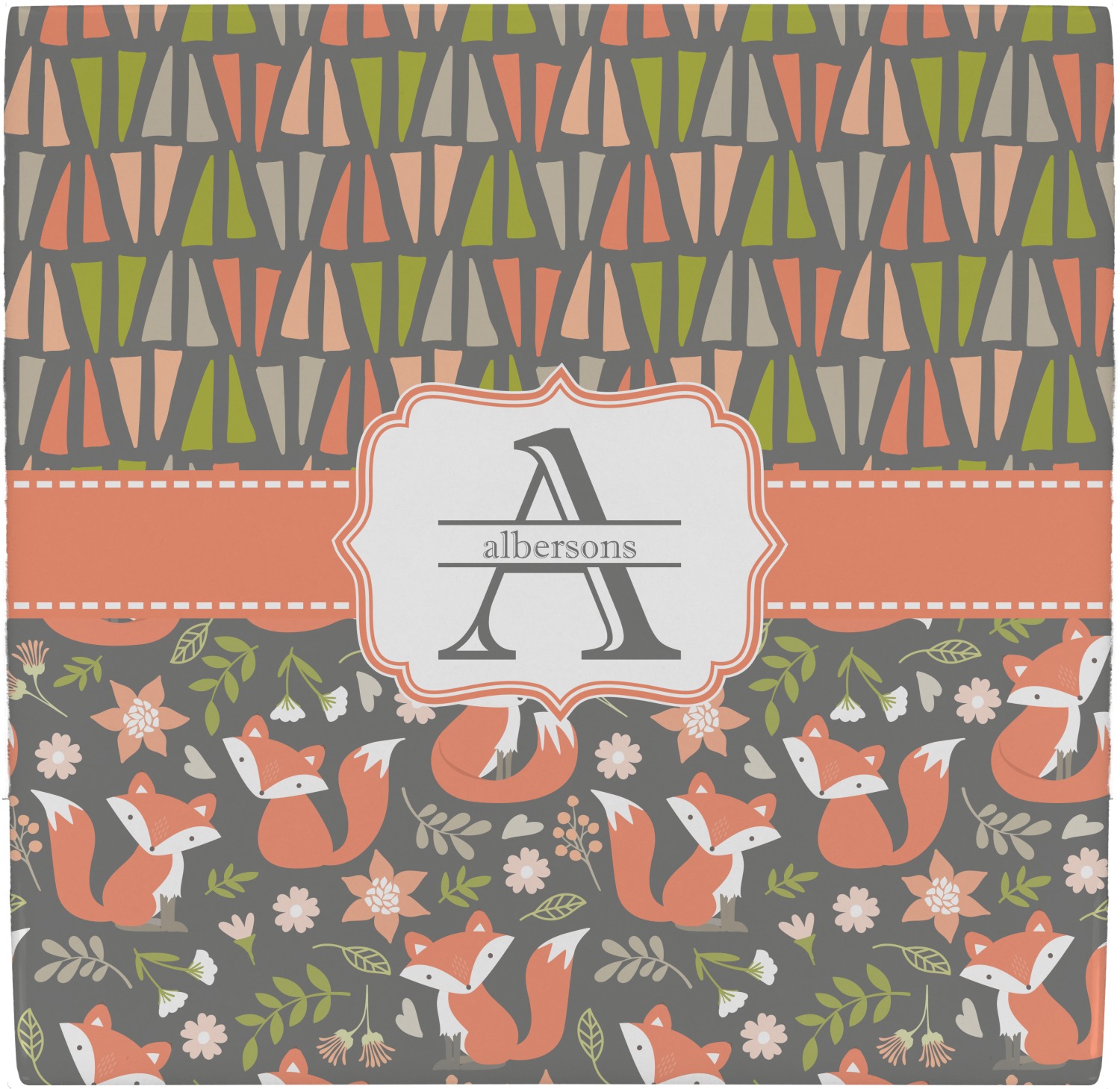 Embrace your inner woodsmen with the Fox Trail Floral design. The bottom of design features an adorable, orange fox surrounded by flowers and leaves on a gray background. On top of the design, there are abstract triangles in orange, green and gray.