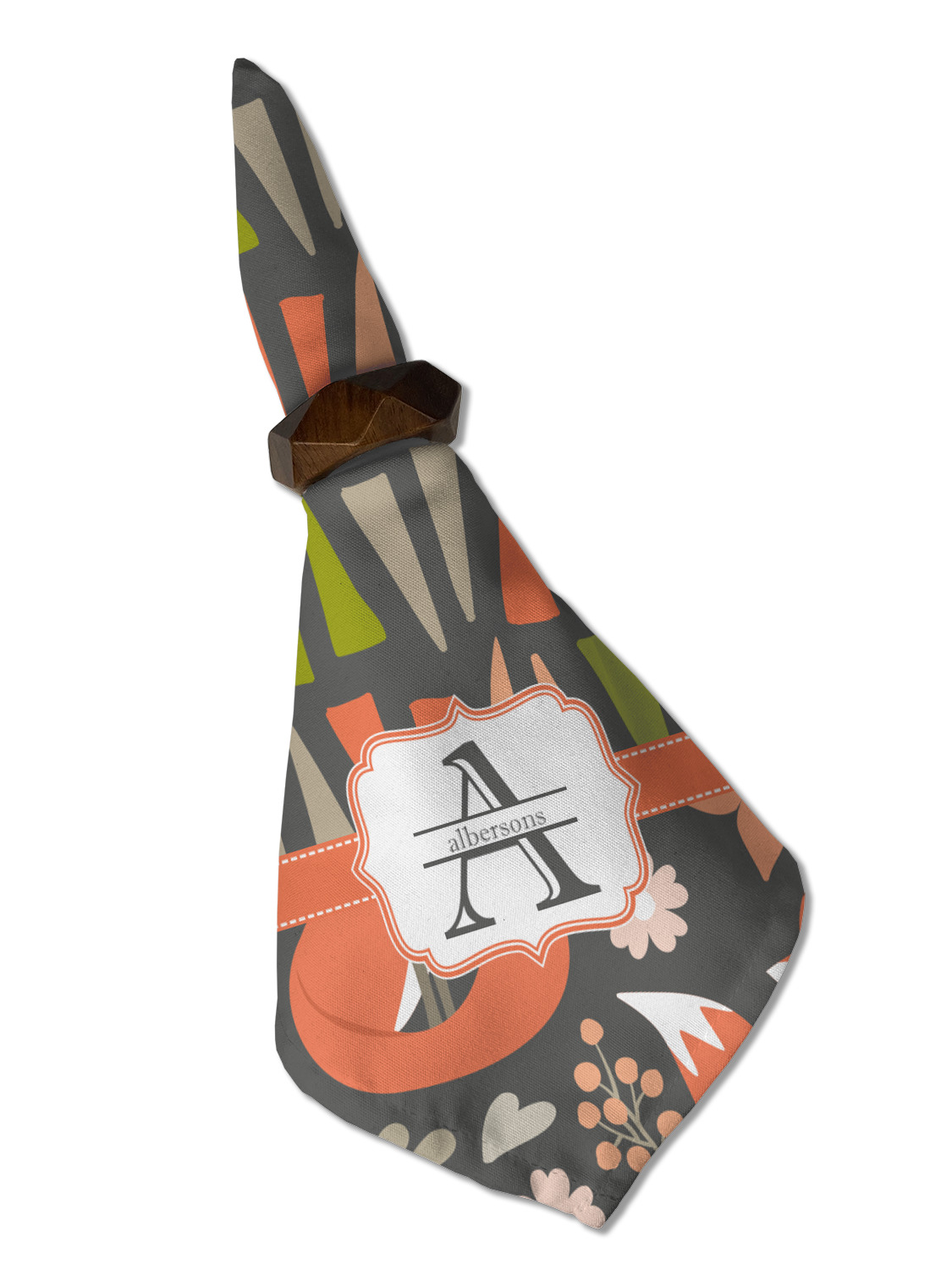 Embrace your inner woodsmen with the Fox Trail Floral design. The bottom of design features an adorable, orange fox surrounded by flowers and leaves on a gray background. On top of the design, there are abstract triangles in orange, green and gray.