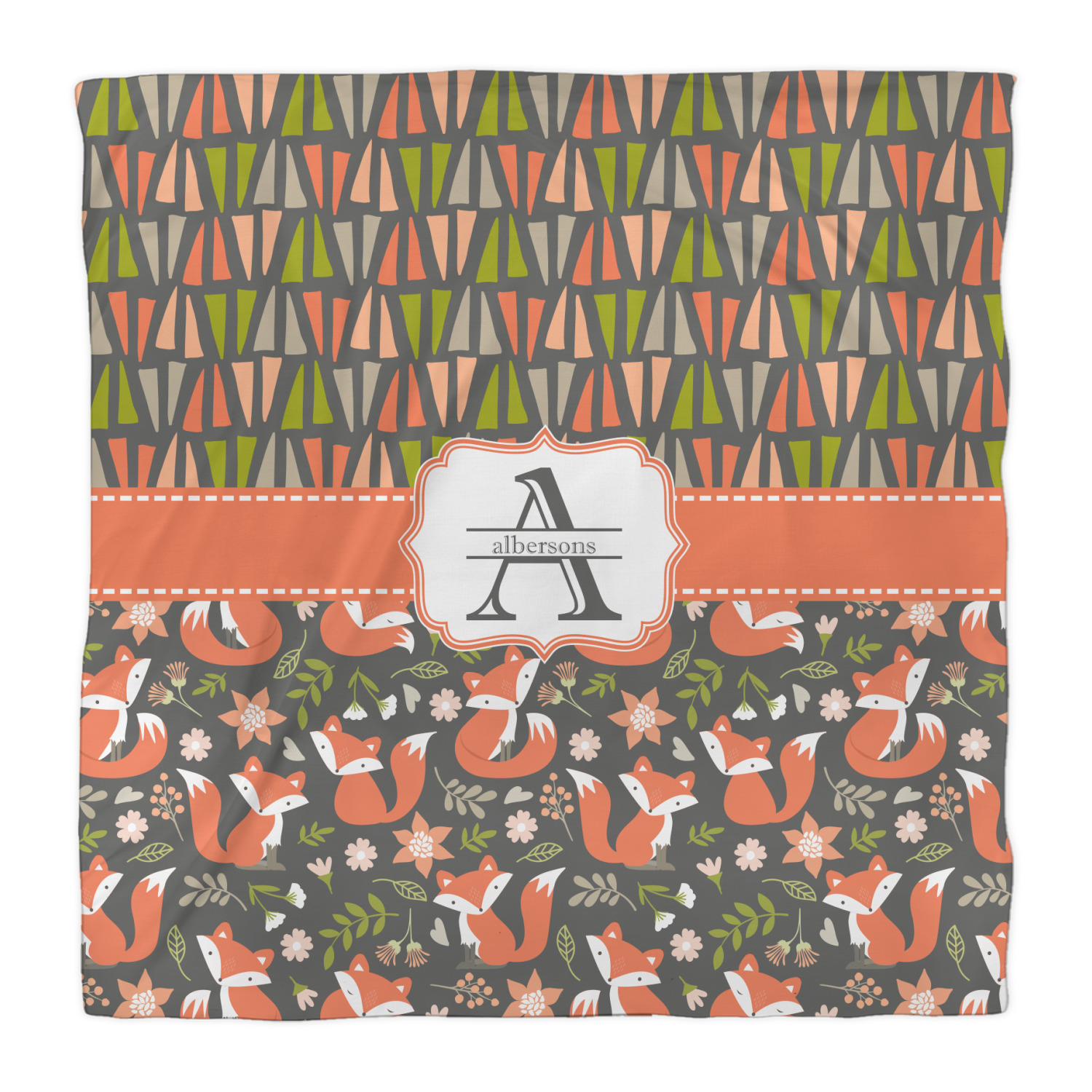 Embrace your inner woodsmen with the Fox Trail Floral design. The bottom of design features an adorable, orange fox surrounded by flowers and leaves on a gray background. On top of the design, there are abstract triangles in orange, green and gray.