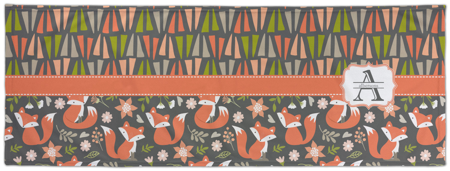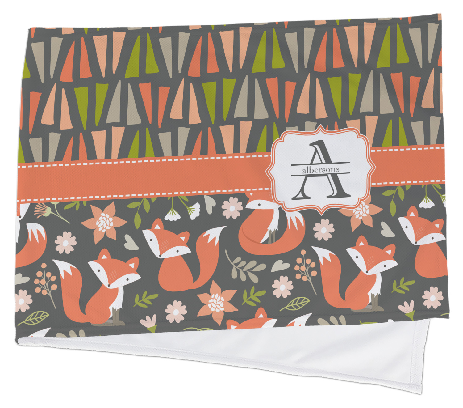 Embrace your inner woodsmen with the Fox Trail Floral design. The bottom of design features an adorable, orange fox surrounded by flowers and leaves on a gray background. On top of the design, there are abstract triangles in orange, green and gray.
