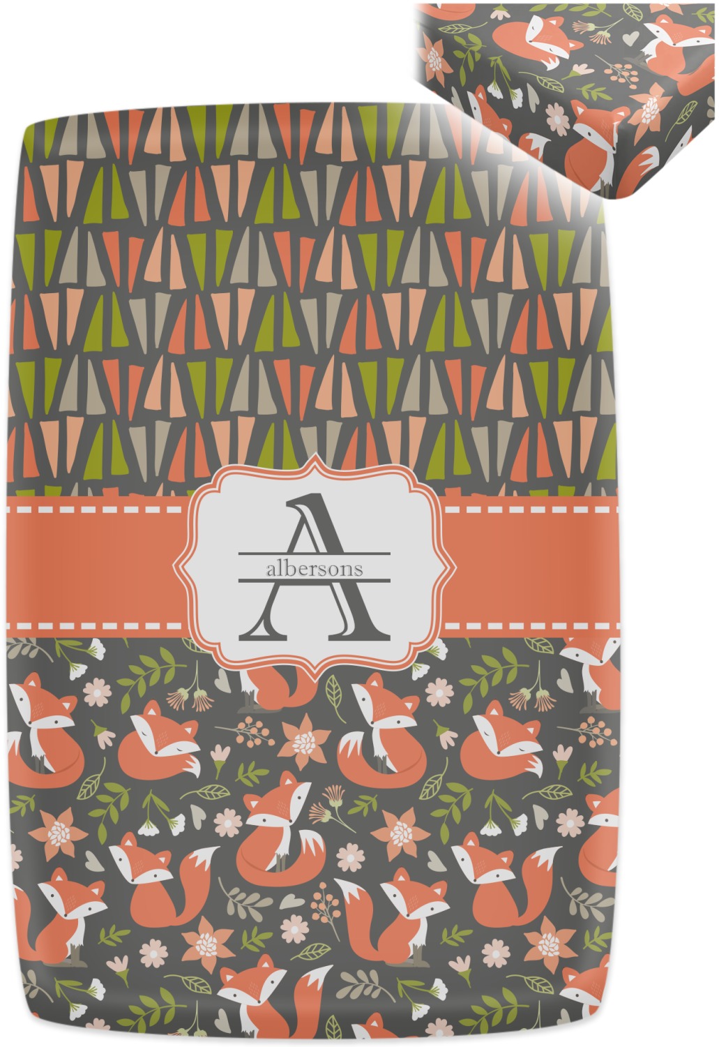 Embrace your inner woodsmen with the Fox Trail Floral design. The bottom of design features an adorable, orange fox surrounded by flowers and leaves on a gray background. On top of the design, there are abstract triangles in orange, green and gray.