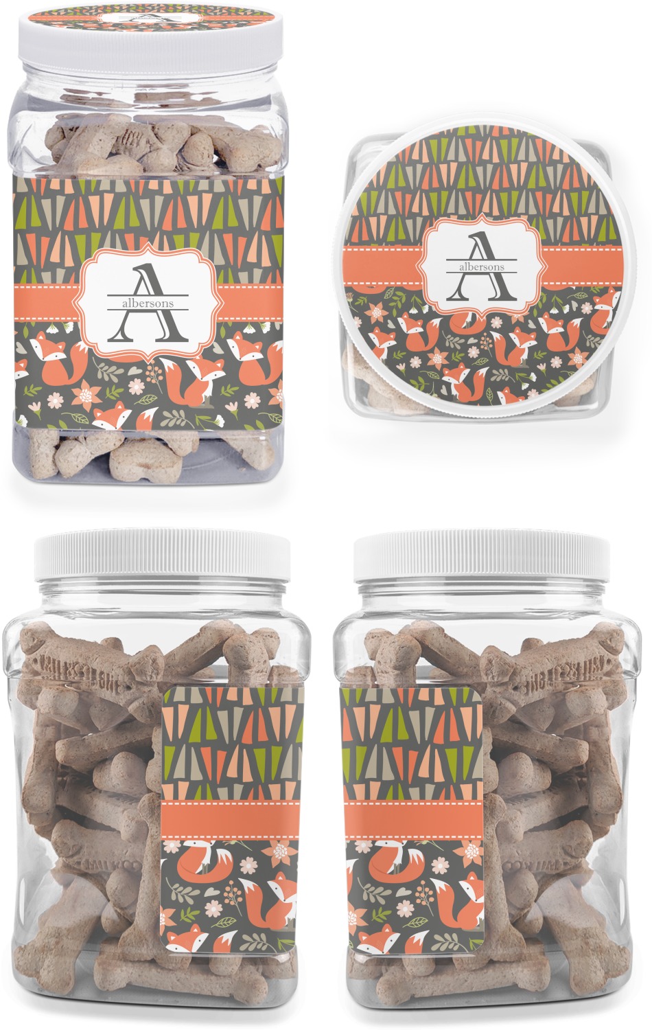 This half gallon jar, made from a sturdy plastic, is the perfect way to keep treats from any naughty pet paws, while still keeping them ready on hand for when your pup performs an impressive trick. This dog cookie jar features a screw-on, white lid that displays your personalized design on a vinyl sticker. We apply another customized sticker that wraps around the front and sides of the jar. Our dog treat jar also has indentations on the rear ends of the sides, which allows for convenient handling, and its square frame allows for easy storage.