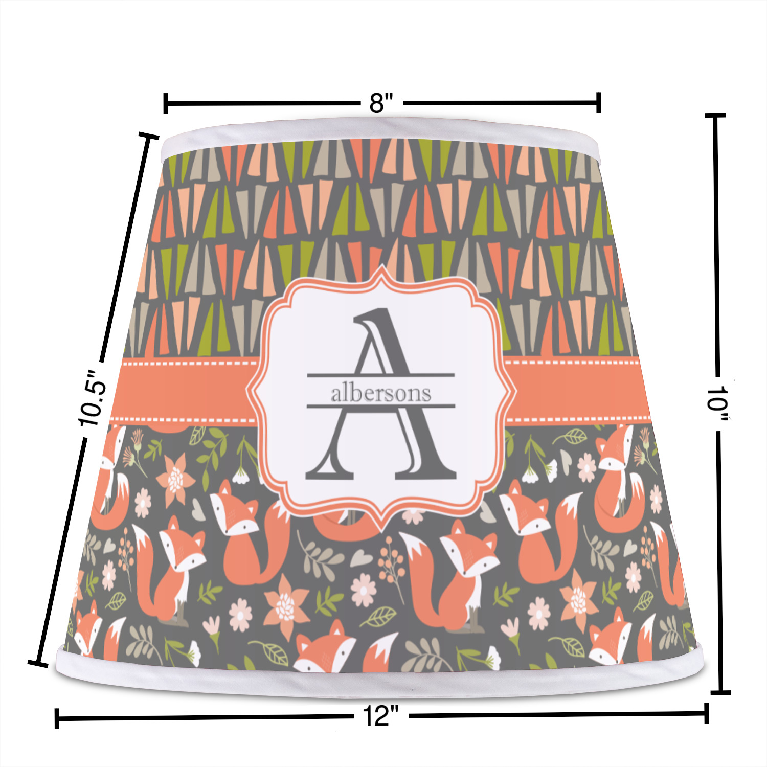 The base of this lampshade is 12 inches in diameter, and the top spans 8 inches in diameter. The total height of the lampshade is 10 inches. The angled nature of this custom lampshade concentrates the light, making it ideal for smaller spaces. This lampshade is made of matte, polyfilm, and displays your customization in its middle. The top and bottom of this colorful lamp shade are lined with a white fabric ribbon (which can be replaced with black inside the design studio) which frames your design and creates a sophisticated finish. As an UNO fitter lampshade, this unique lamp shade will fit a variety of bases.