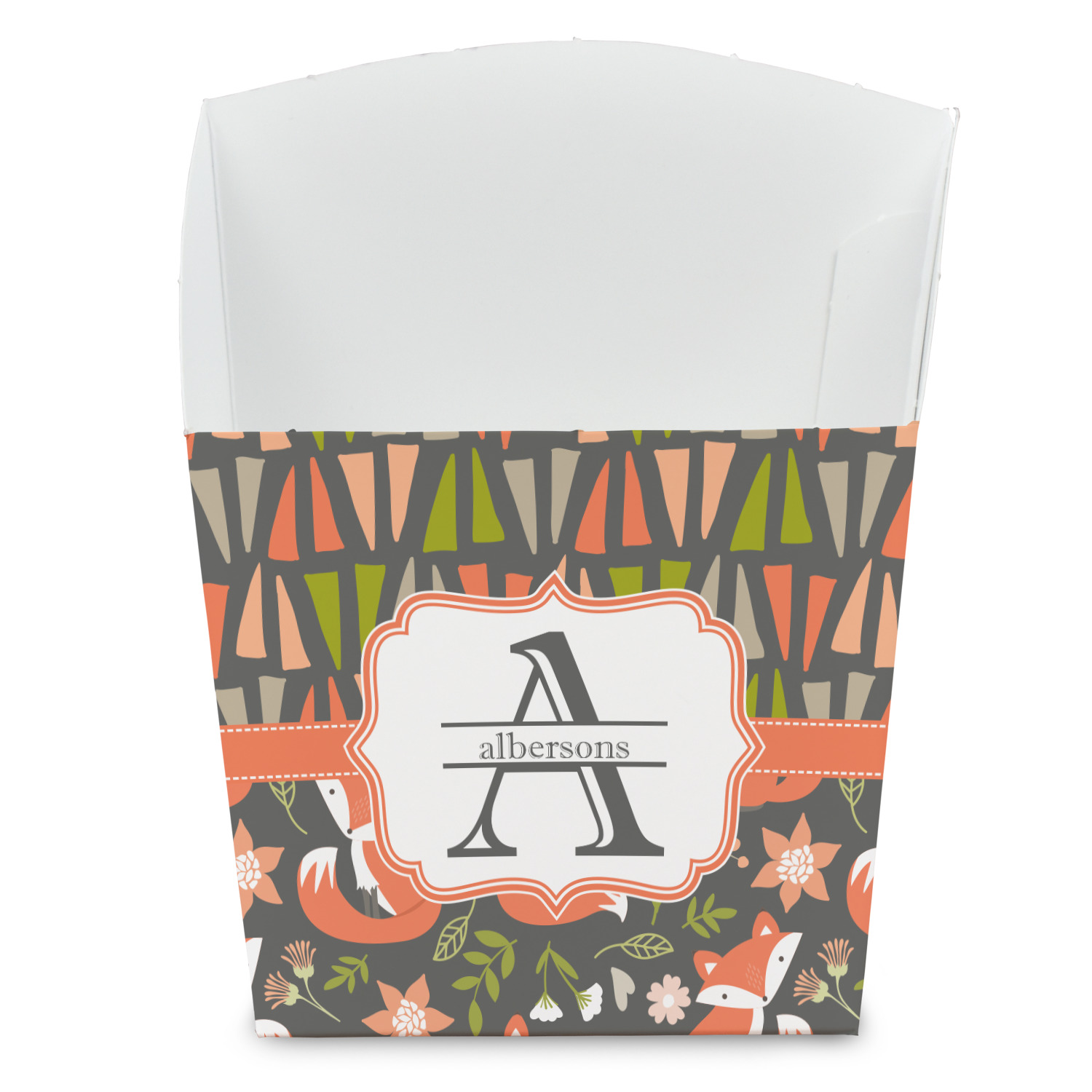 Embrace your inner woodsmen with the Fox Trail Floral design. The bottom of design features an adorable, orange fox surrounded by flowers and leaves on a gray background. On top of the design, there are abstract triangles in orange, green and gray.