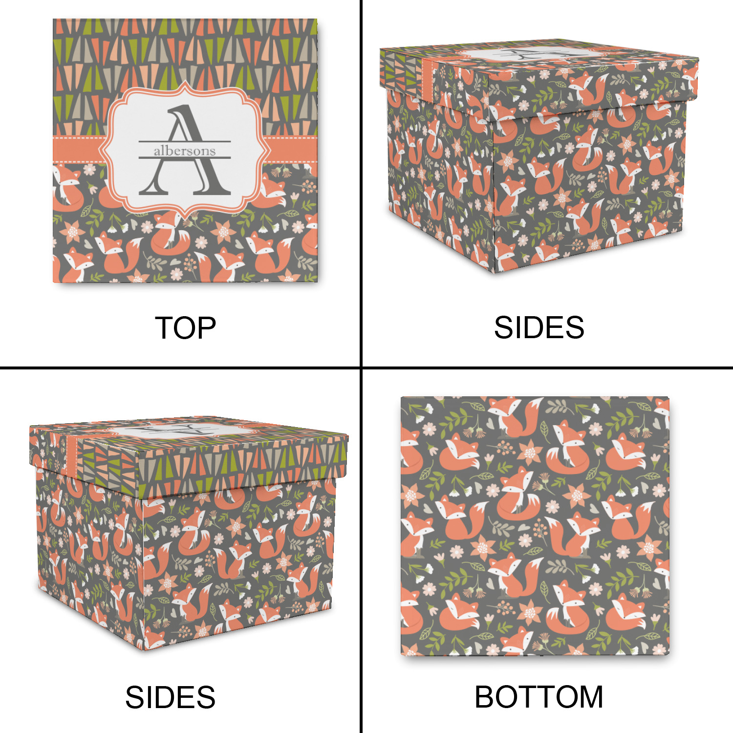 Embrace your inner woodsmen with the Fox Trail Floral design. The bottom of design features an adorable, orange fox surrounded by flowers and leaves on a gray background. On top of the design, there are abstract triangles in orange, green and gray.