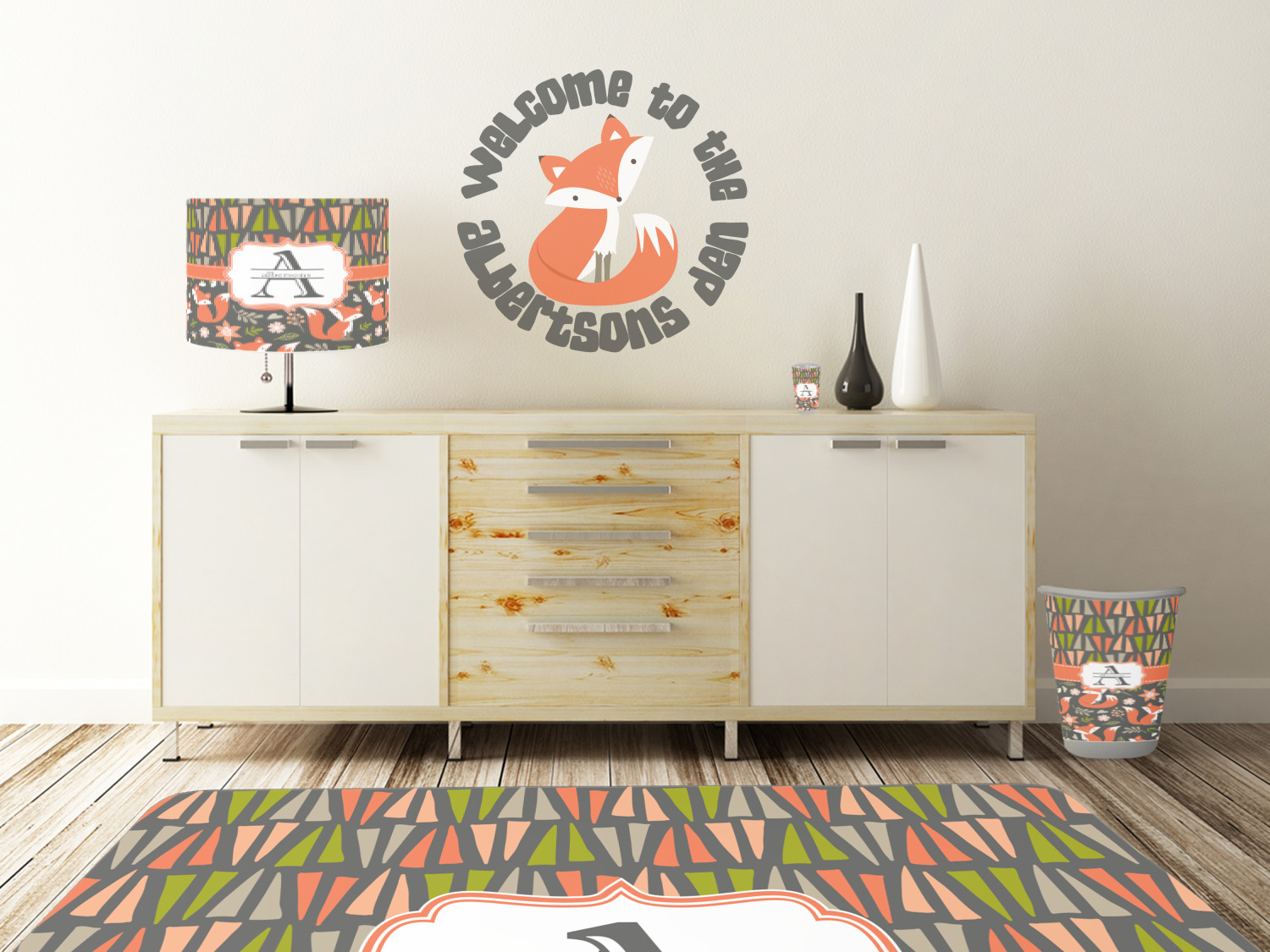 Embrace your inner woodsmen with the Fox Trail Floral design. The bottom of design features an adorable, orange fox surrounded by flowers and leaves on a gray background. On top of the design, there are abstract triangles in orange, green and gray.