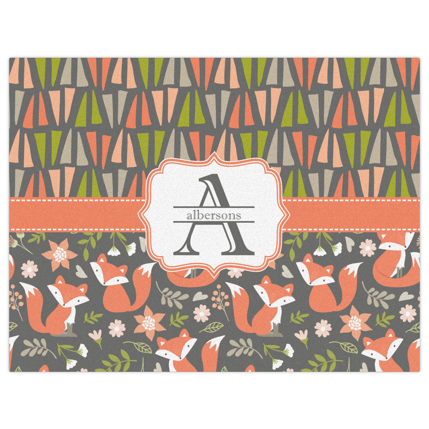 Embrace your inner woodsmen with the Fox Trail Floral design. The bottom of design features an adorable, orange fox surrounded by flowers and leaves on a gray background. On top of the design, there are abstract triangles in orange, green and gray.