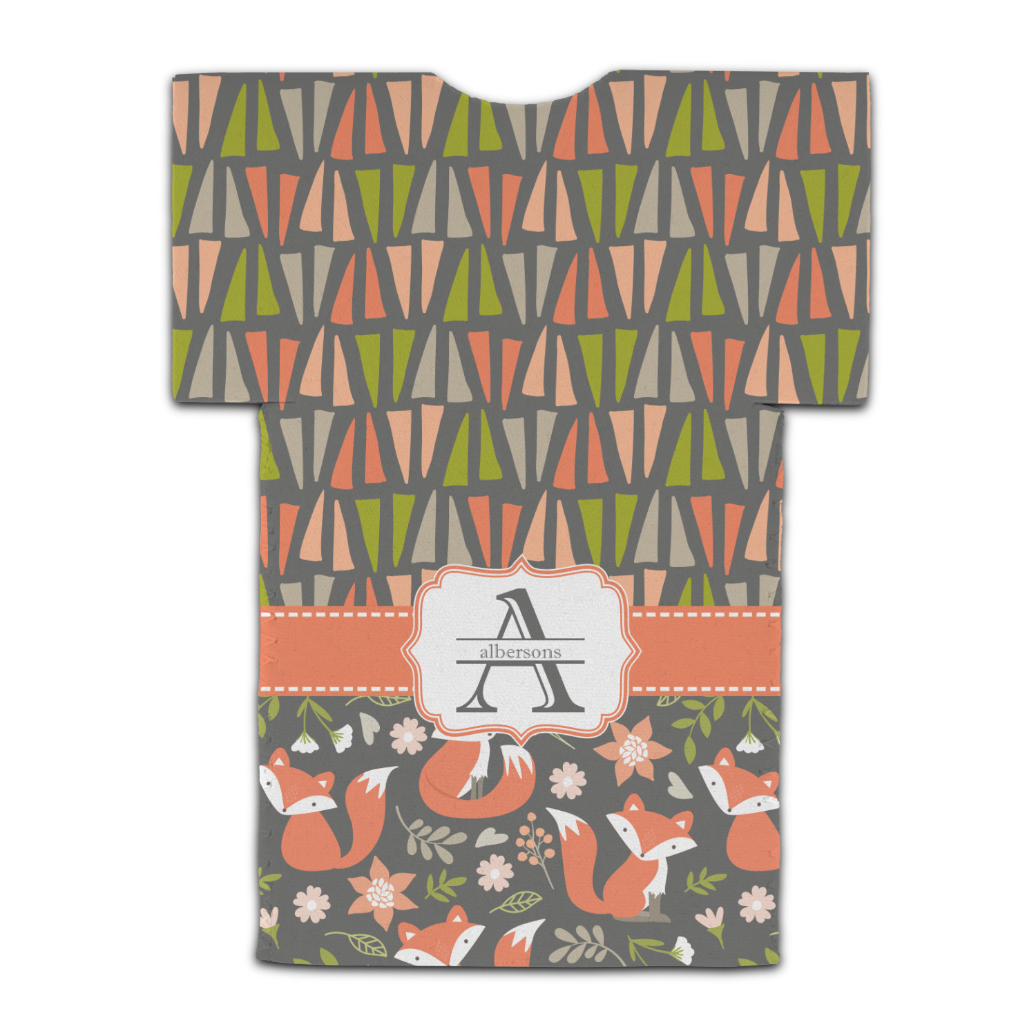 Embrace your inner woodsmen with the Fox Trail Floral design. The bottom of design features an adorable, orange fox surrounded by flowers and leaves on a gray background. On top of the design, there are abstract triangles in orange, green and gray.