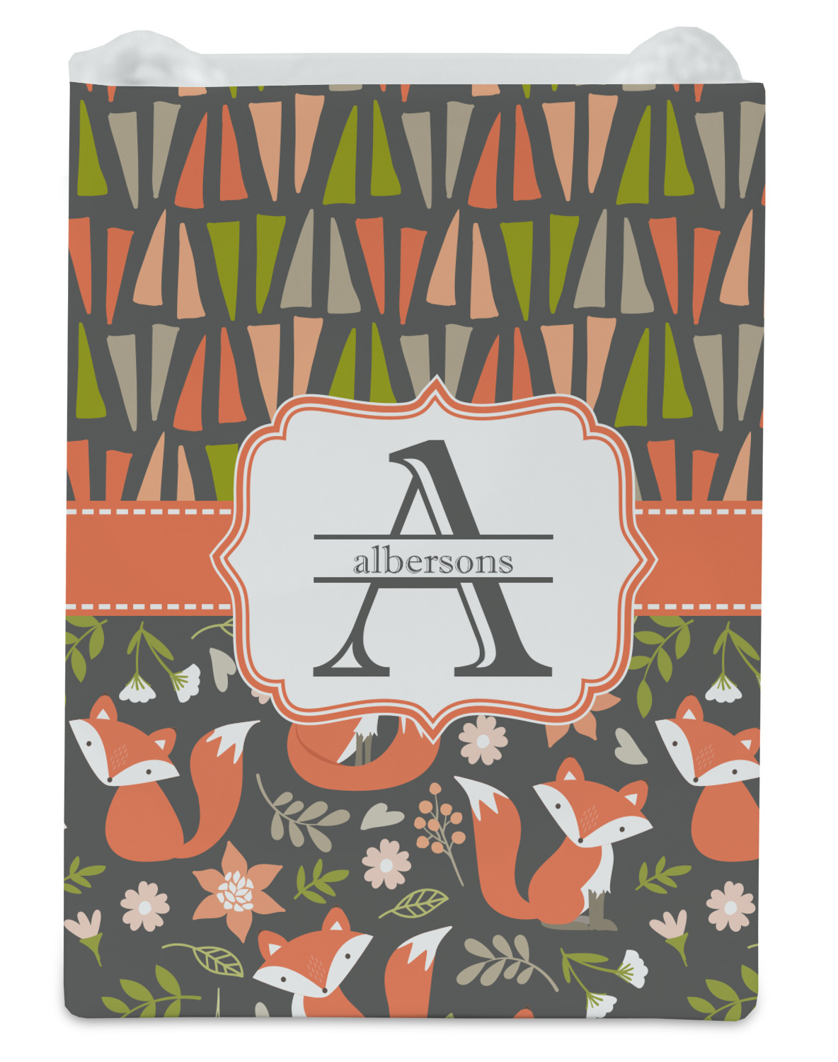 Embrace your inner woodsmen with the Fox Trail Floral design. The bottom of design features an adorable, orange fox surrounded by flowers and leaves on a gray background. On top of the design, there are abstract triangles in orange, green and gray.