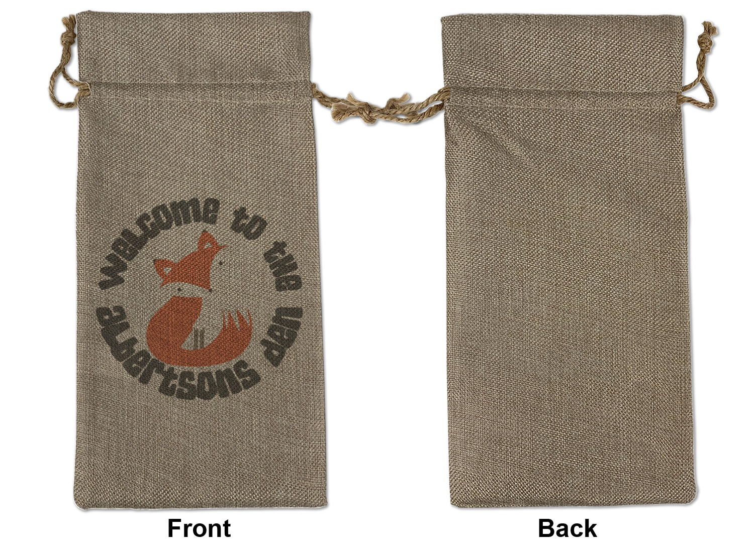We sell our Burlap Gift Bags in 3 variant sized bags. Made with burlap polyester, each personalized bag can be secured with a twine drawstring pull. Your custom design is available to print on one side or both sides - completely up to you! The sizes of the bags measure approximately 4.5" x 6.5" for the smallest size, 6.5" x 8.0" for the medium size, and 6.5" x 13.5" for the large-sized bag.