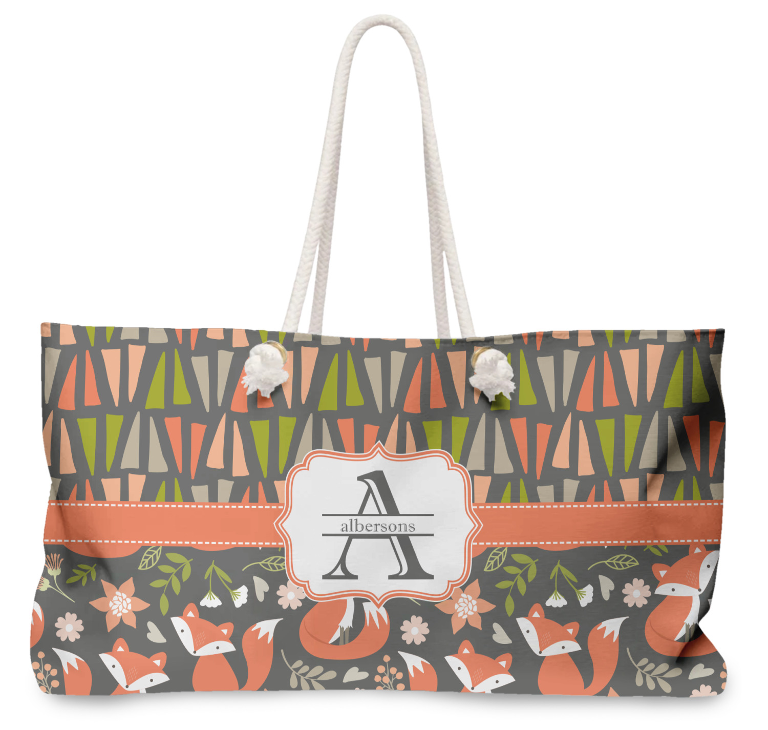 Our oversized weekender tote with rope handles is perfect for your weekend at the beach or on the town. This large tote are 24" W X 13" H, with a 5" gusset and a 27" thick rope handles with a knot that is put through a grommeted brass hole.