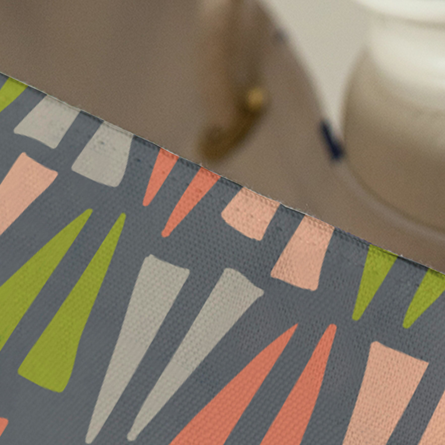 Embrace your inner woodsmen with the Fox Trail Floral design. The bottom of design features an adorable, orange fox surrounded by flowers and leaves on a gray background. On top of the design, there are abstract triangles in orange, green and gray.