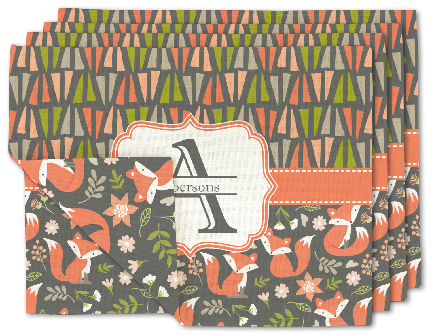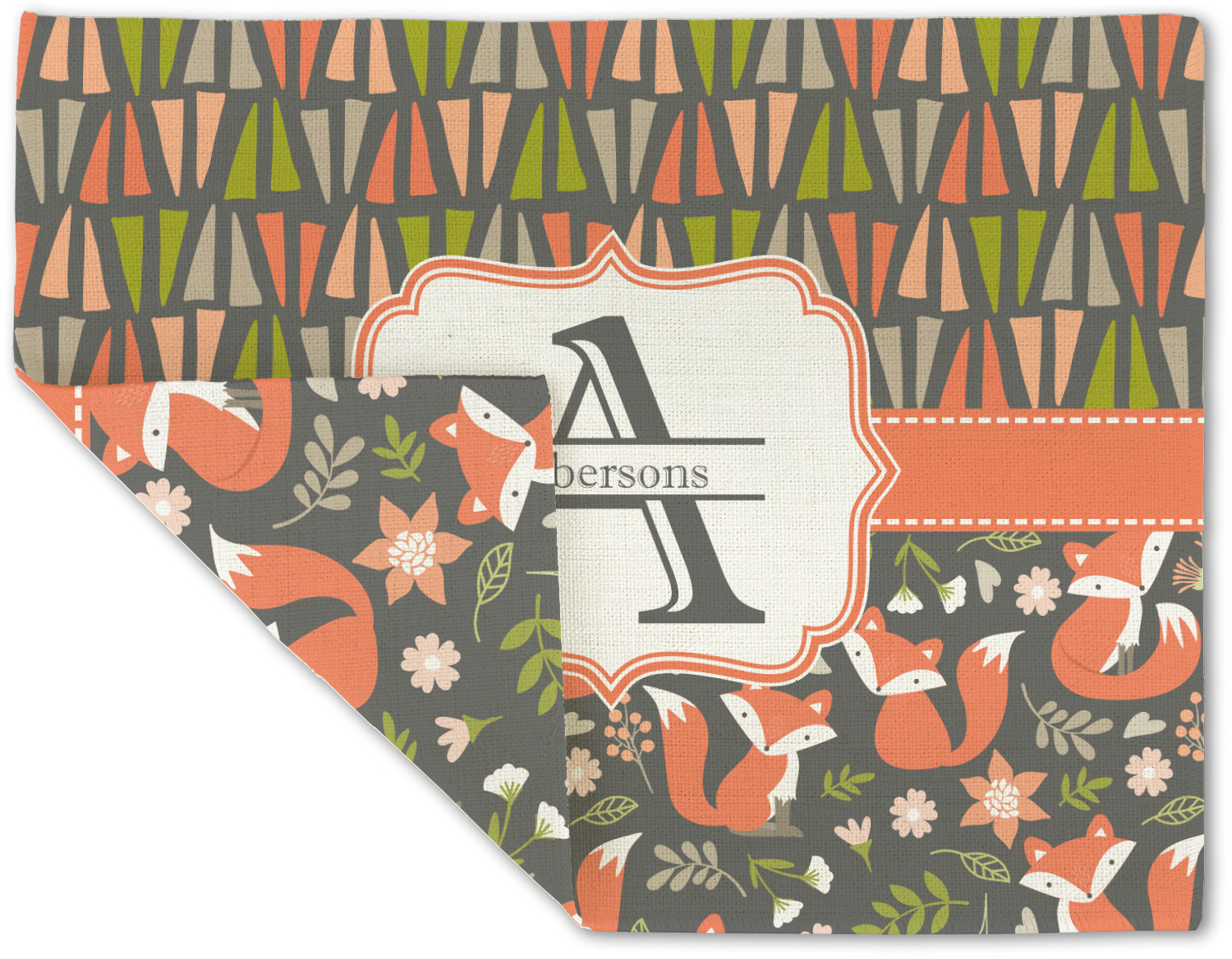 Embrace your inner woodsmen with the Fox Trail Floral design. The bottom of design features an adorable, orange fox surrounded by flowers and leaves on a gray background. On top of the design, there are abstract triangles in orange, green and gray.