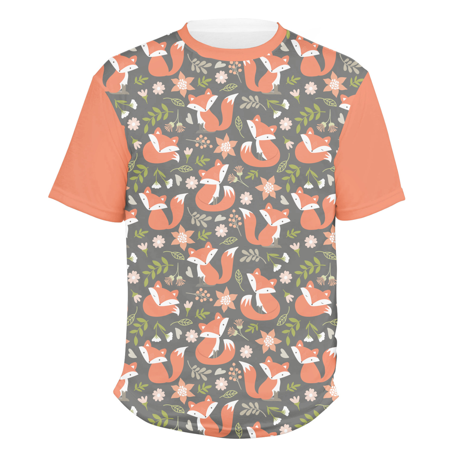 Embrace your inner woodsmen with the Fox Trail Floral design. The bottom of design features an adorable, orange fox surrounded by flowers and leaves on a gray background. On top of the design, there are abstract triangles in orange, green and gray.