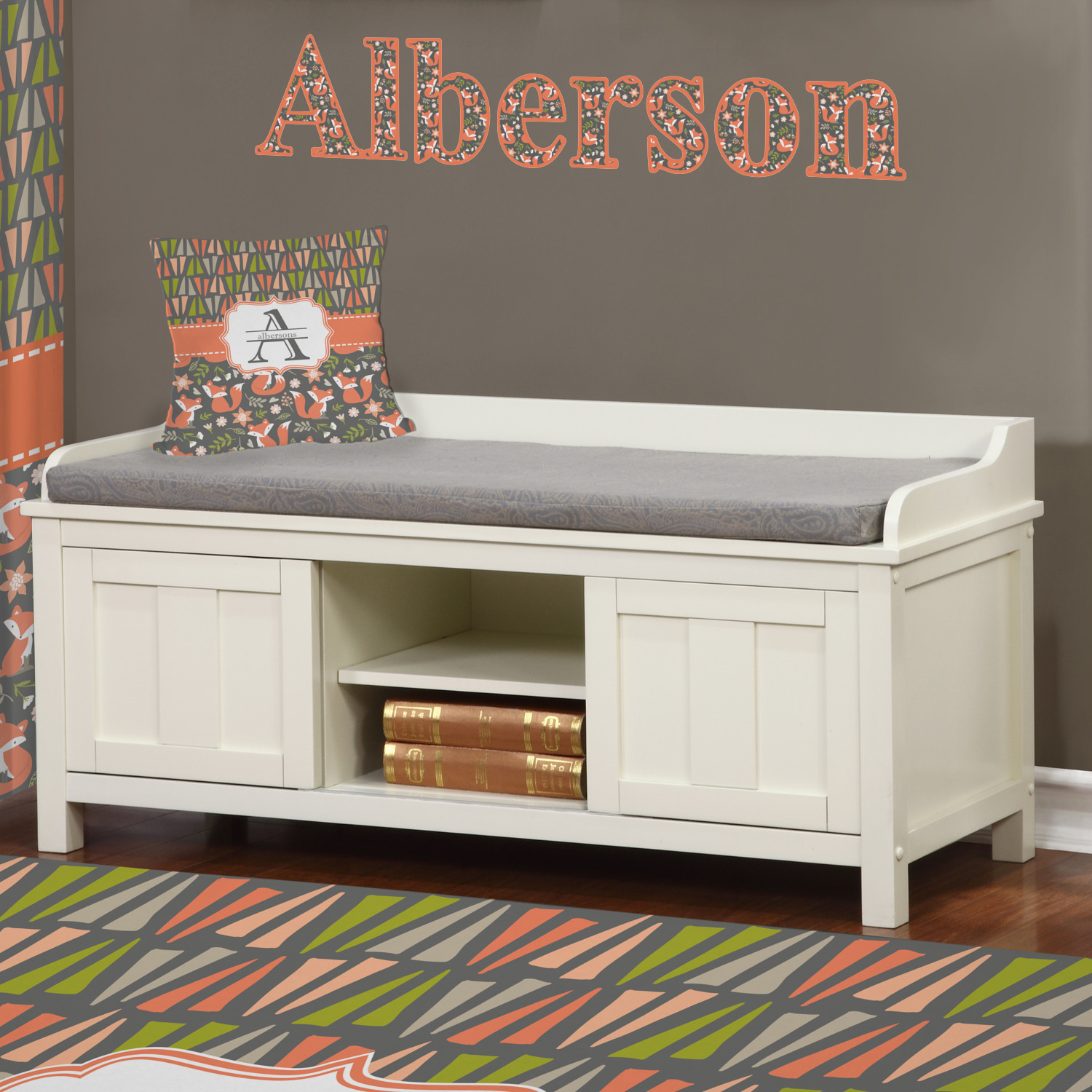 Embrace your inner woodsmen with the Fox Trail Floral design. The bottom of design features an adorable, orange fox surrounded by flowers and leaves on a gray background. On top of the design, there are abstract triangles in orange, green and gray.