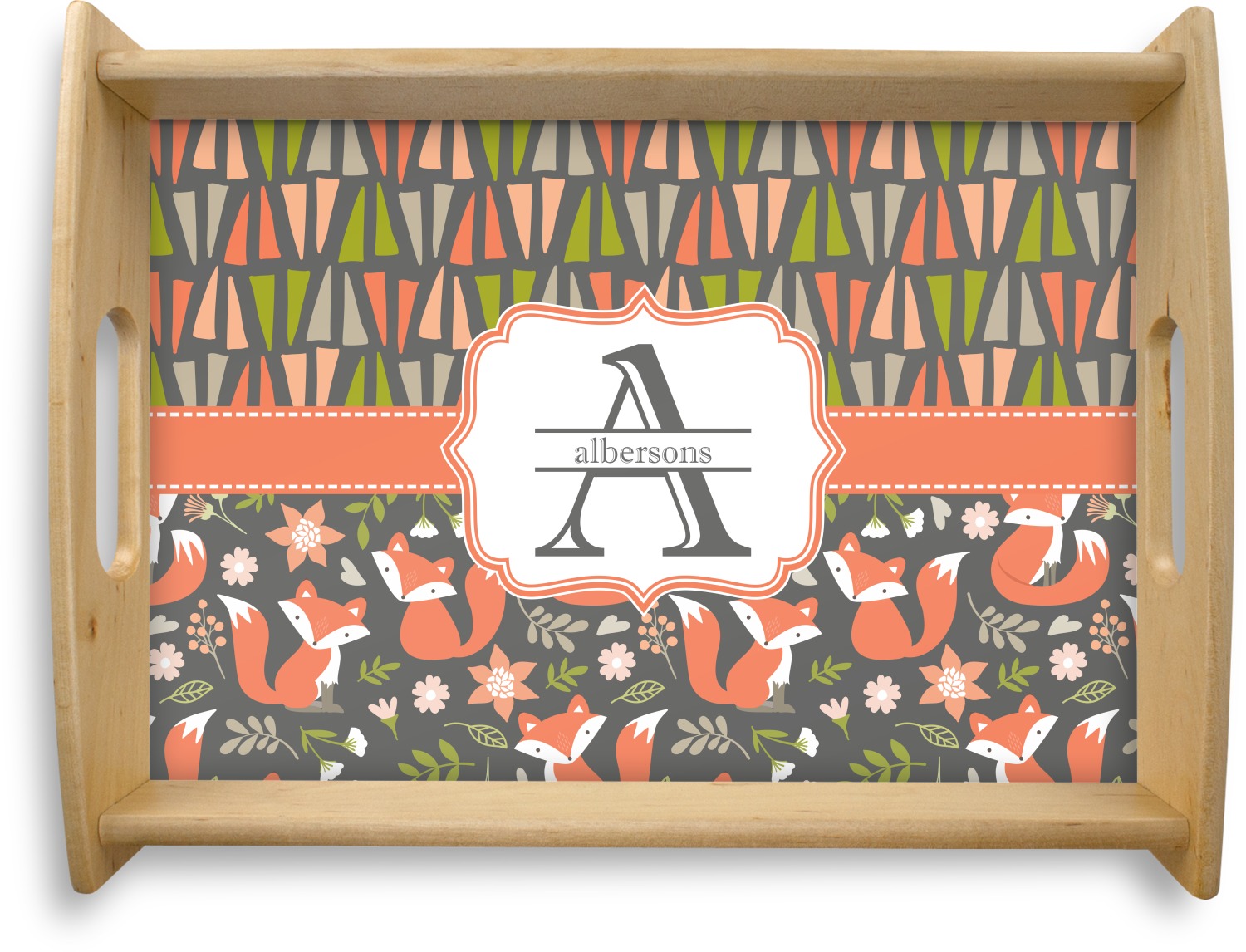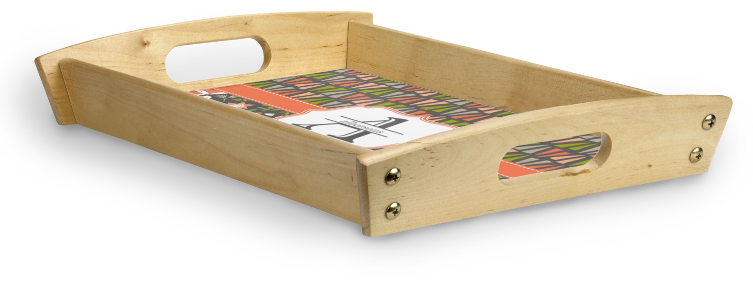 This serving tray with handles features square edges and two rounded sides, creating a very modern look. Each side is fabricated from a beautifully cut, natural wood. The bottom of the interior of the tray displays your customized design in bright, vibrant color. The tray is sold in both a black color and a natural wood look. Each variation of the wood serving tray has two sizes: Small, which is 14" x 10" x 2.25", and Large, which is 19.5" x 13.5" x 2.75".