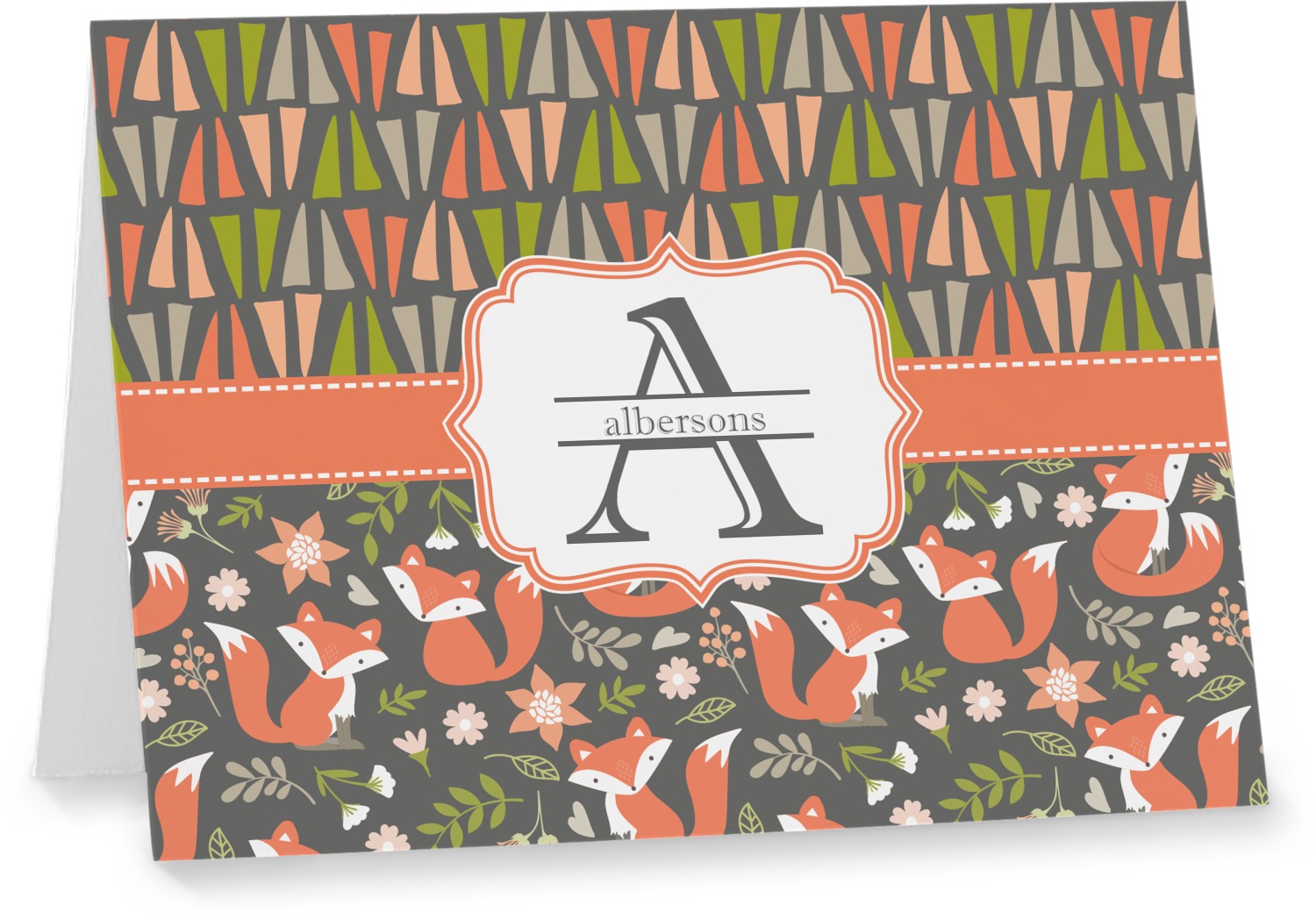 Embrace your inner woodsmen with the Fox Trail Floral design. The bottom of design features an adorable, orange fox surrounded by flowers and leaves on a gray background. On top of the design, there are abstract triangles in orange, green and gray.