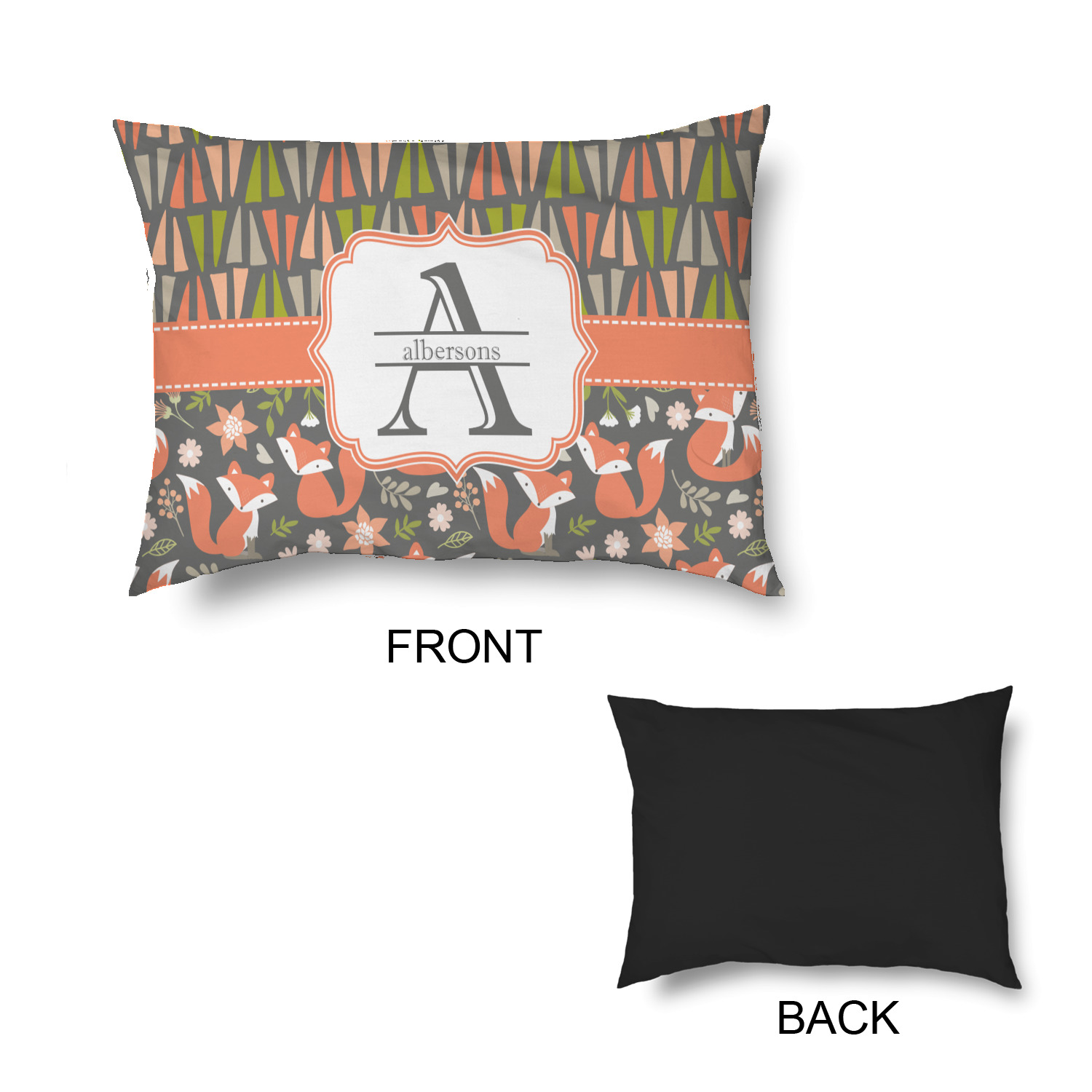 Embrace your inner woodsmen with the Fox Trail Floral design. The bottom of design features an adorable, orange fox surrounded by flowers and leaves on a gray background. On top of the design, there are abstract triangles in orange, green and gray.