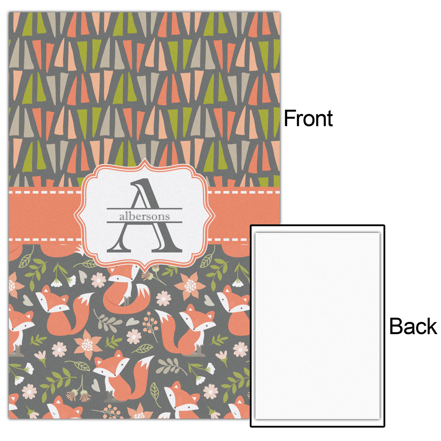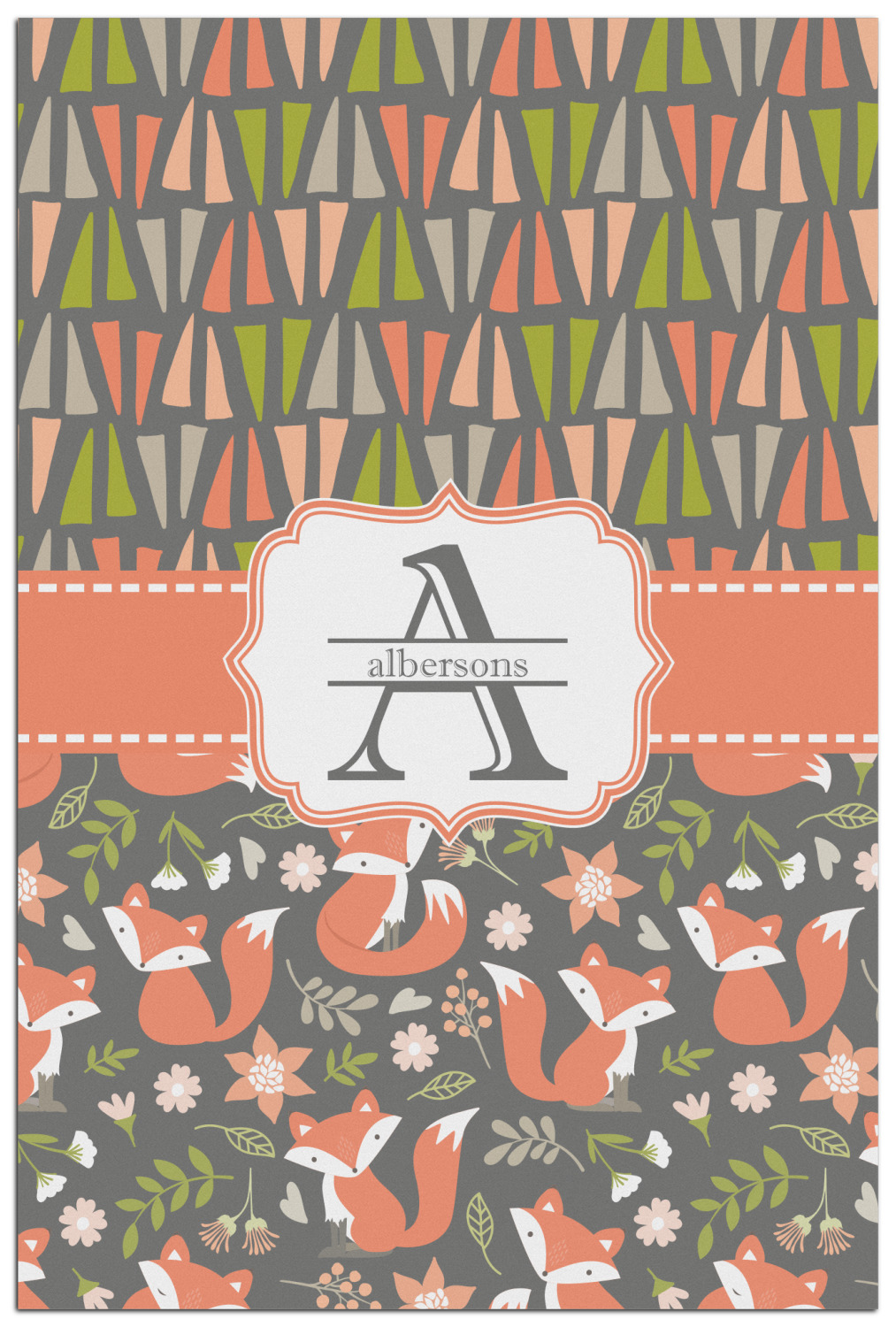Embrace your inner woodsmen with the Fox Trail Floral design. The bottom of design features an adorable, orange fox surrounded by flowers and leaves on a gray background. On top of the design, there are abstract triangles in orange, green and gray.