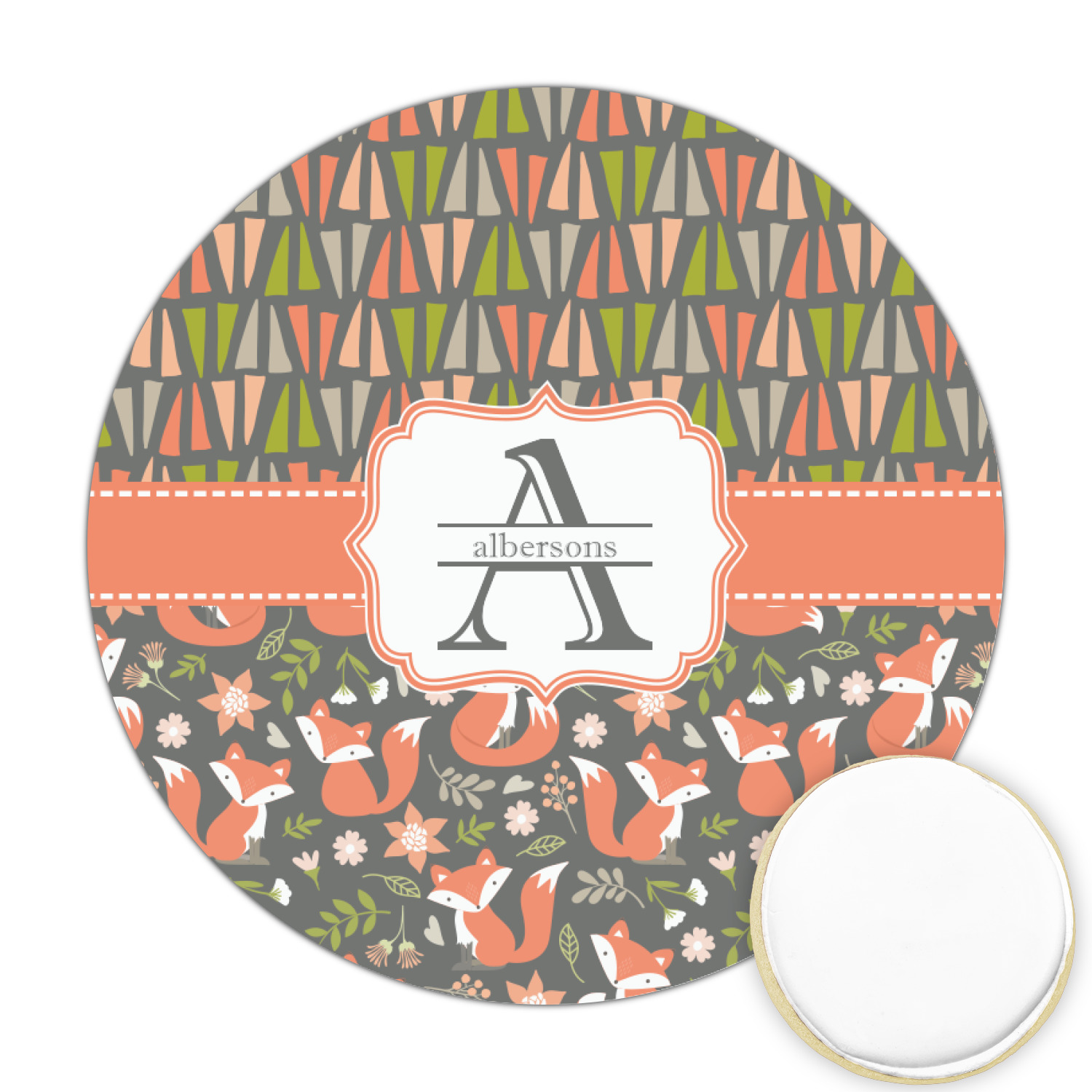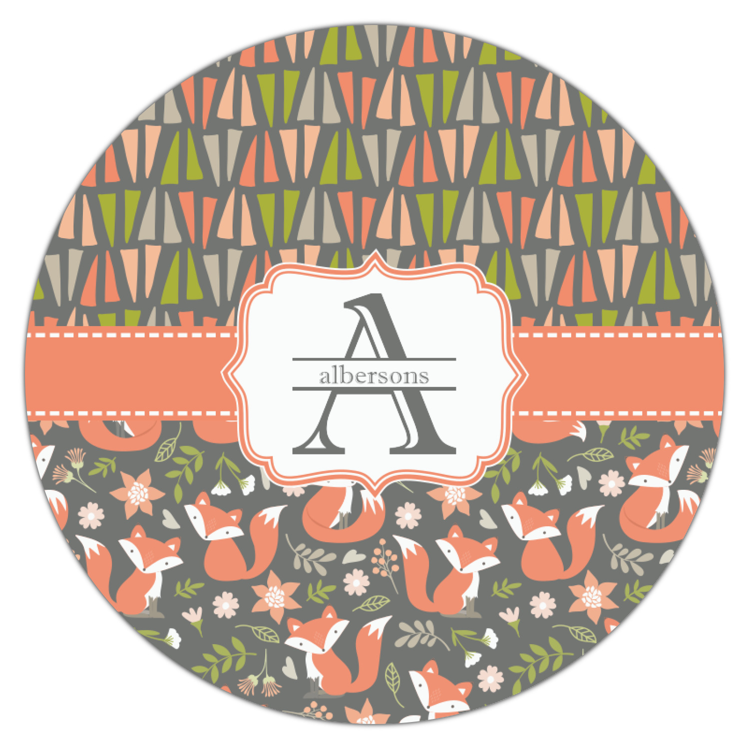 Embrace your inner woodsmen with the Fox Trail Floral design. The bottom of design features an adorable, orange fox surrounded by flowers and leaves on a gray background. On top of the design, there are abstract triangles in orange, green and gray.