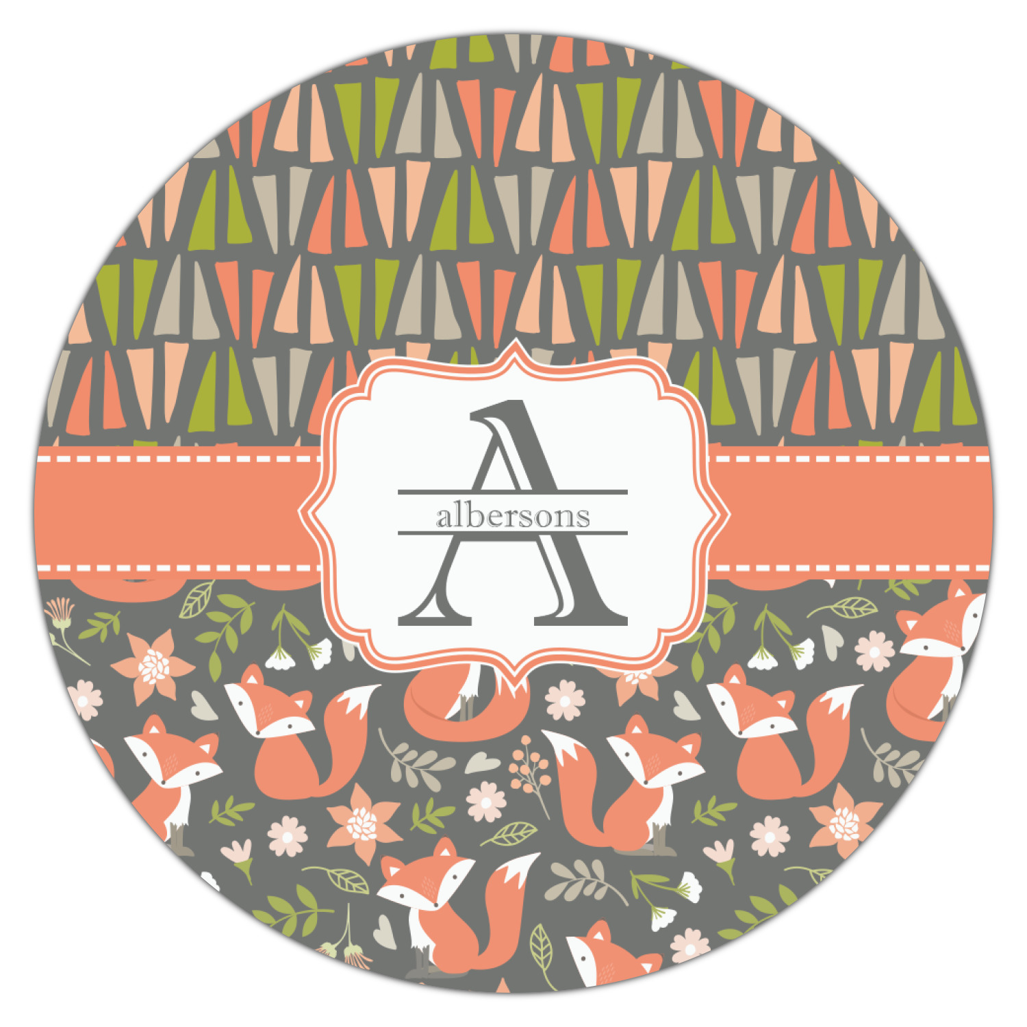 Embrace your inner woodsmen with the Fox Trail Floral design. The bottom of design features an adorable, orange fox surrounded by flowers and leaves on a gray background. On top of the design, there are abstract triangles in orange, green and gray.