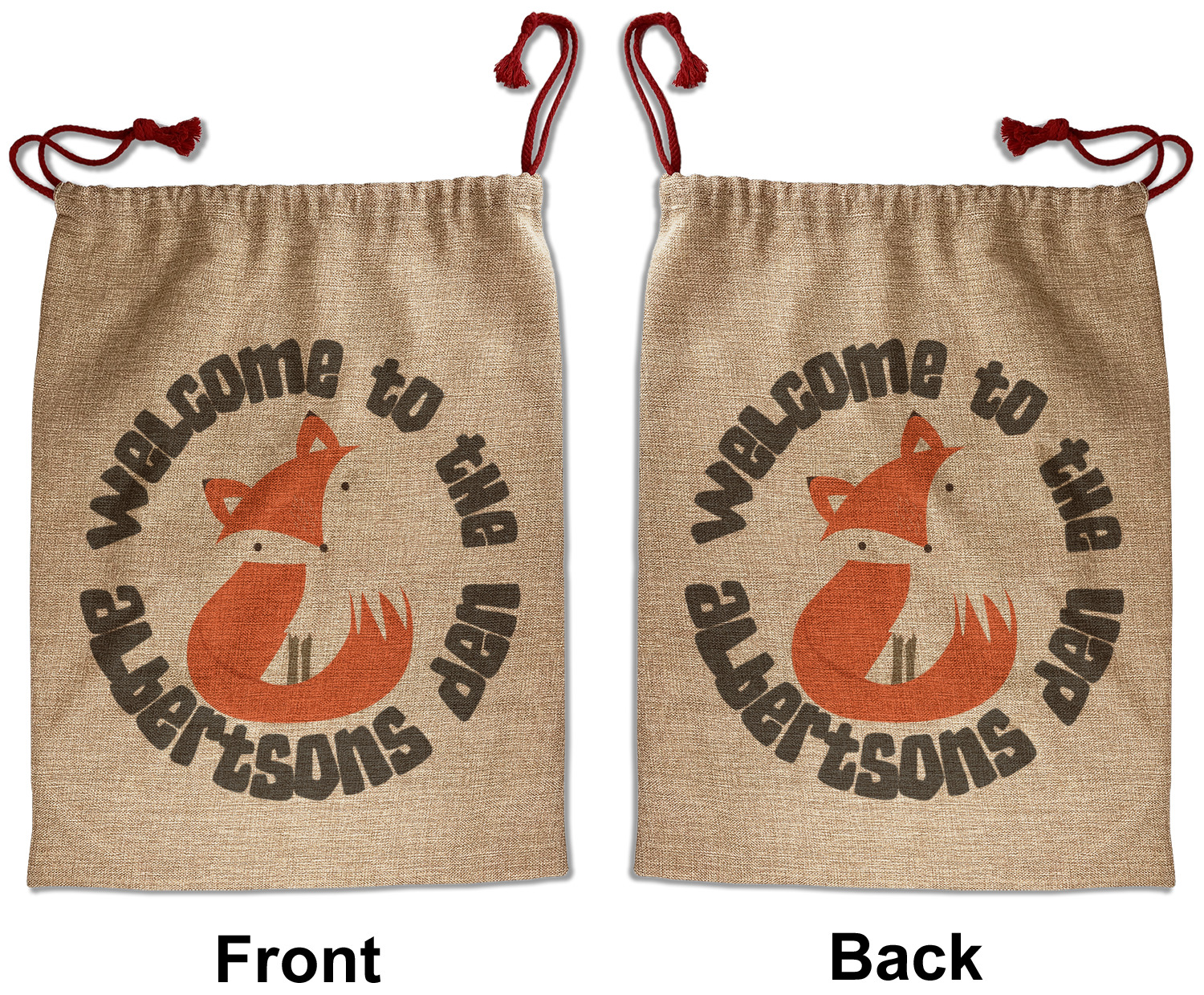 Our Santa sacks print your design on the burlap material giving it a nice rustic, natural design! The burlap material is also machine washable and wrinkle-free, so feel free to fold and store out Santa bags until the next time you need it! Secure your gifts with our red accent drawstring ties at the top of the sack so the mystery of your gift stays a surprise until Christmas day. We offer two types of printing- one side partial print or double-sided partial printing. Design and personalize your own Santa sack in time for the holidays!