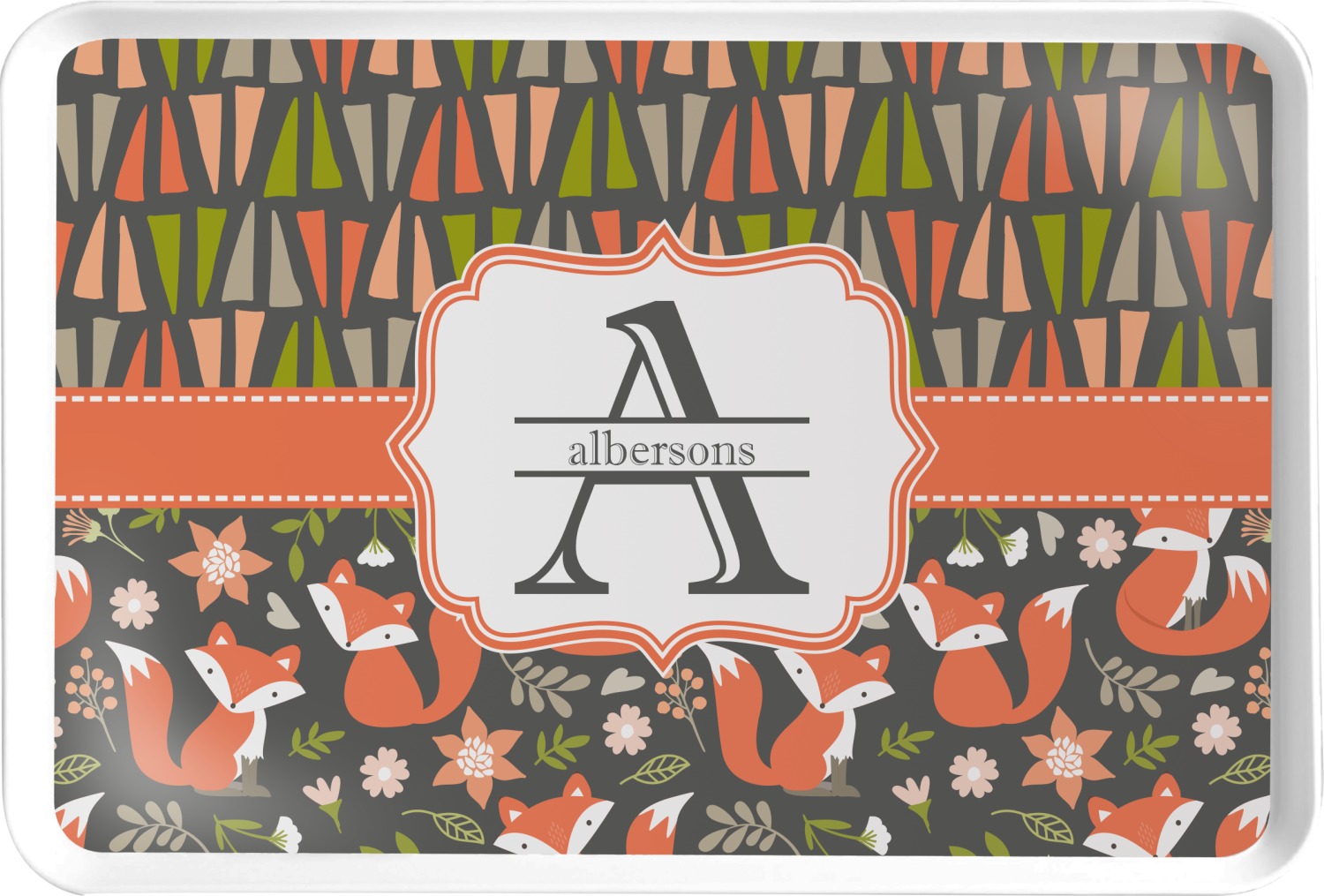 Made from a heavy melamine, these decorative trays are break resistant and are BPA free. At 14" x 9.25", these serving dishes are spacious enough to accommodate several drinks, bowls, or more. The tray features ridges underneath that allow for a sturdy stance upon any table or counter-top. We display your customization at the bottom of the tray's interior, while the remaining sides of the tray are a chic white.