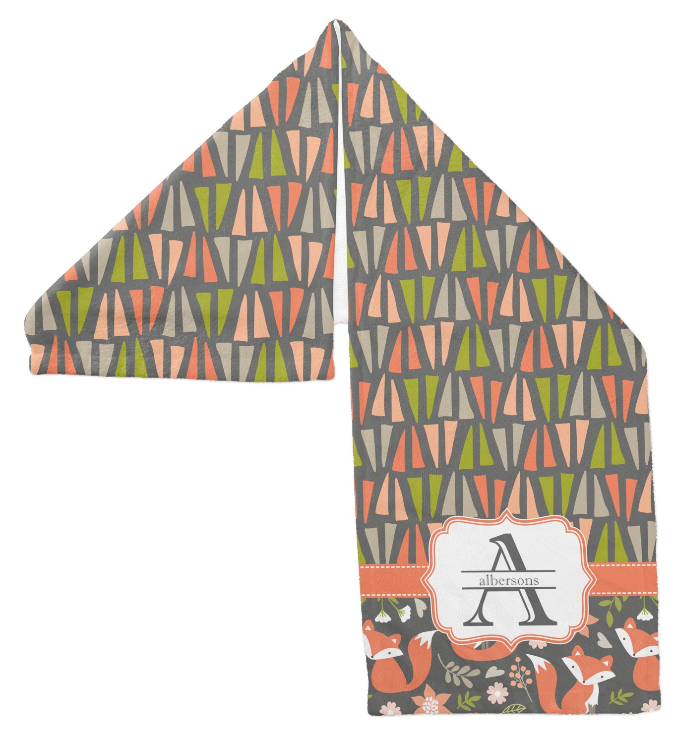 Embrace your inner woodsmen with the Fox Trail Floral design. The bottom of design features an adorable, orange fox surrounded by flowers and leaves on a gray background. On top of the design, there are abstract triangles in orange, green and gray.