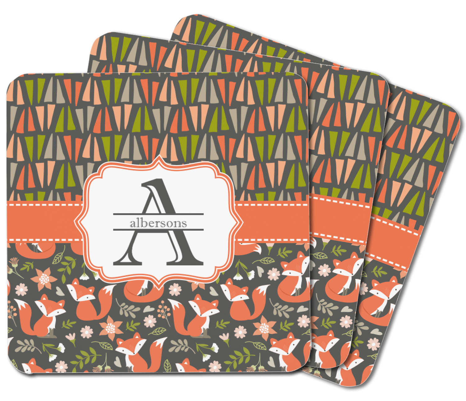 Embrace your inner woodsmen with the Fox Trail Floral design. The bottom of design features an adorable, orange fox surrounded by flowers and leaves on a gray background. On top of the design, there are abstract triangles in orange, green and gray.