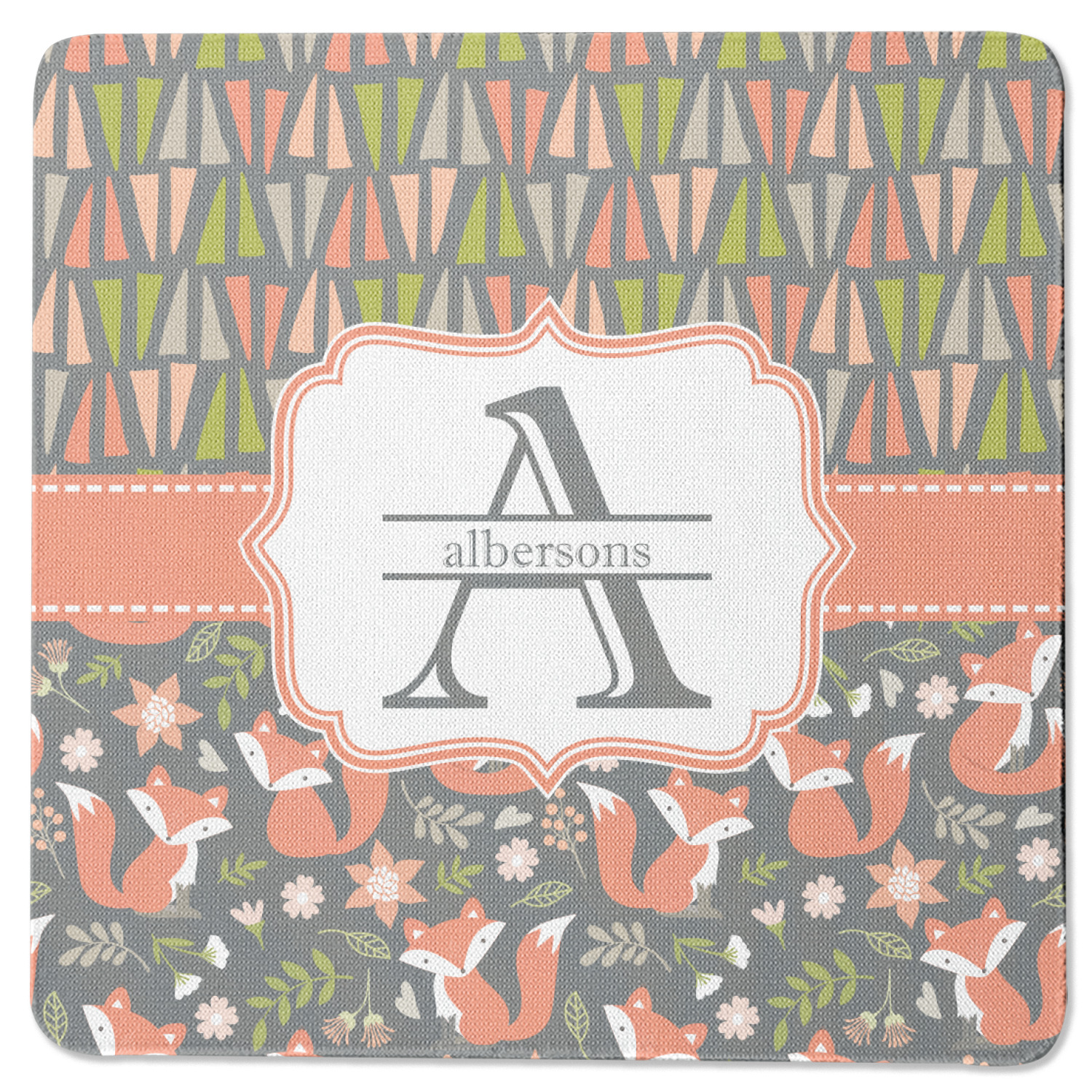 Embrace your inner woodsmen with the Fox Trail Floral design. The bottom of design features an adorable, orange fox surrounded by flowers and leaves on a gray background. On top of the design, there are abstract triangles in orange, green and gray.