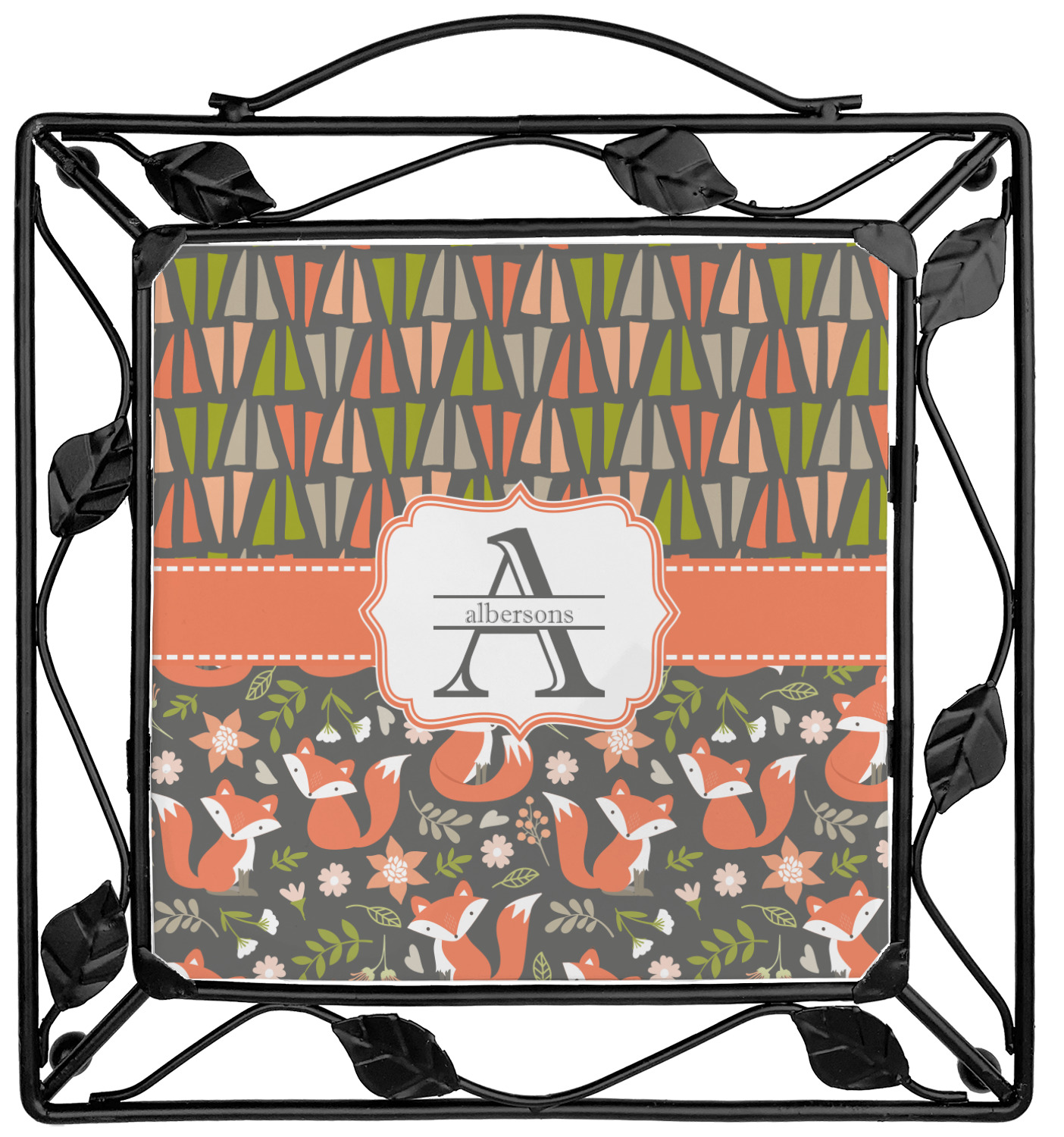 Our square trivets are made from a durable, wrought iron. This model features 4 small half circles, one on each corner, and a larger ring of iron that circles the central, customized tile. Each of the 4 corners has a round foot on its bottom for stability. This trivet is 8.75 by 8.75 inches, but the central tile measures at 6 inches on both sides.