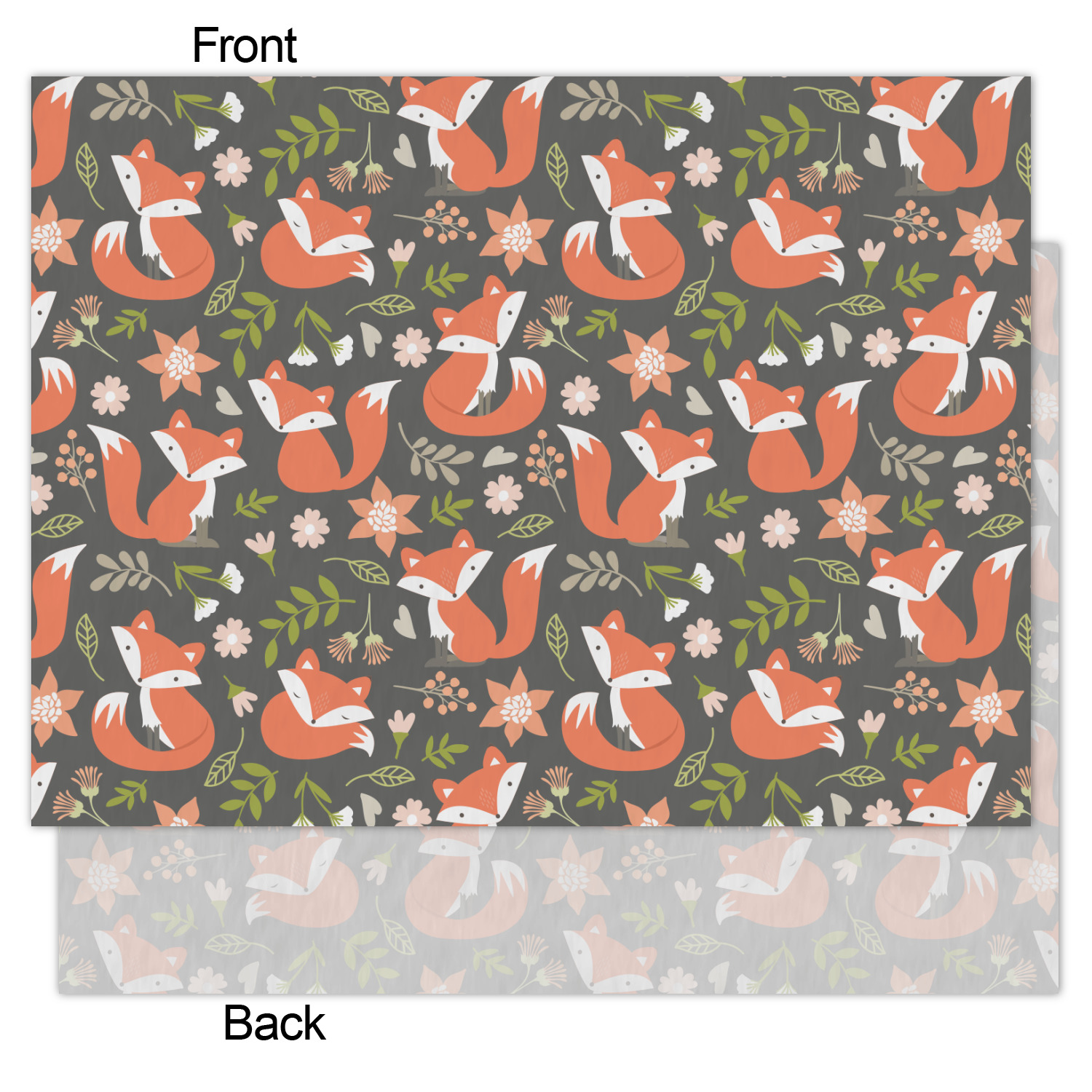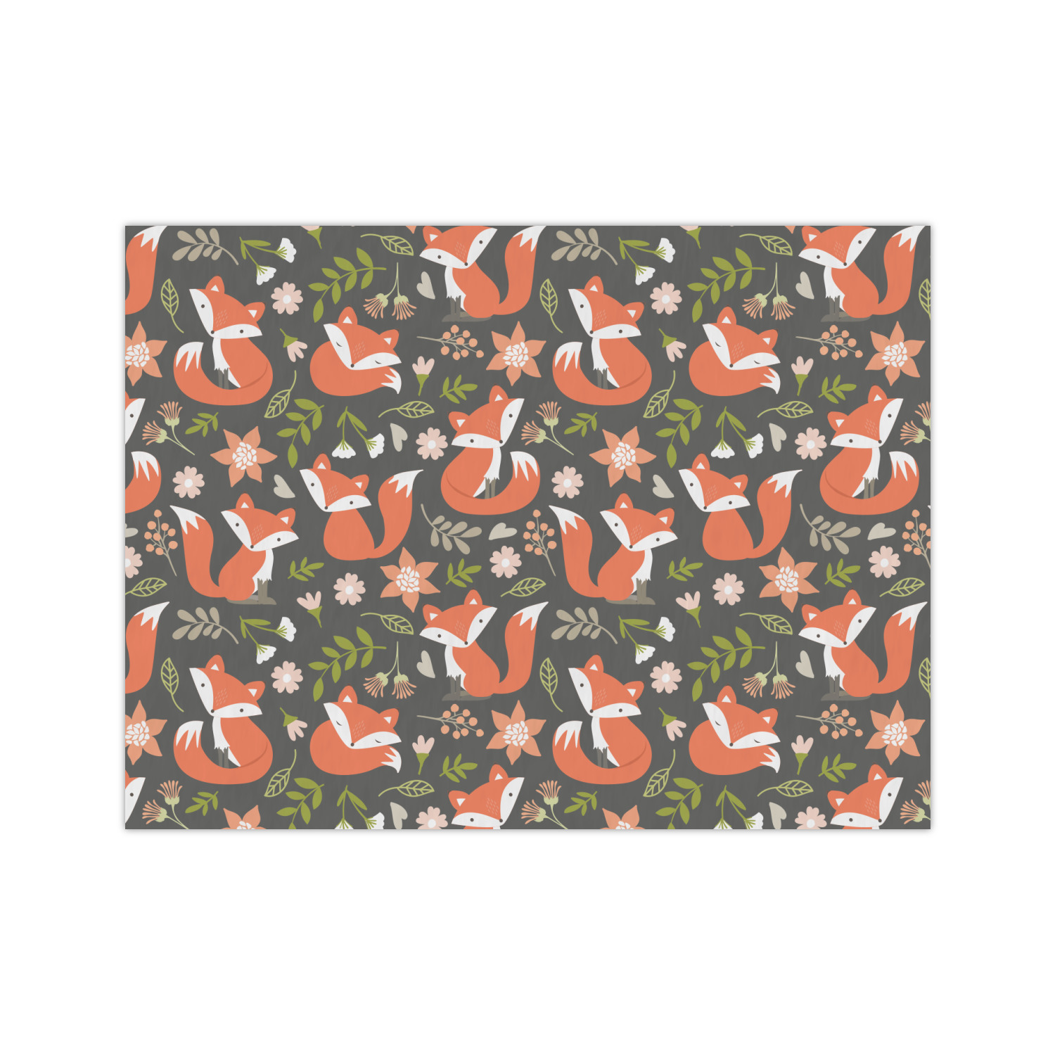 Embrace your inner woodsmen with the Fox Trail Floral design. The bottom of design features an adorable, orange fox surrounded by flowers and leaves on a gray background. On top of the design, there are abstract triangles in orange, green and gray.