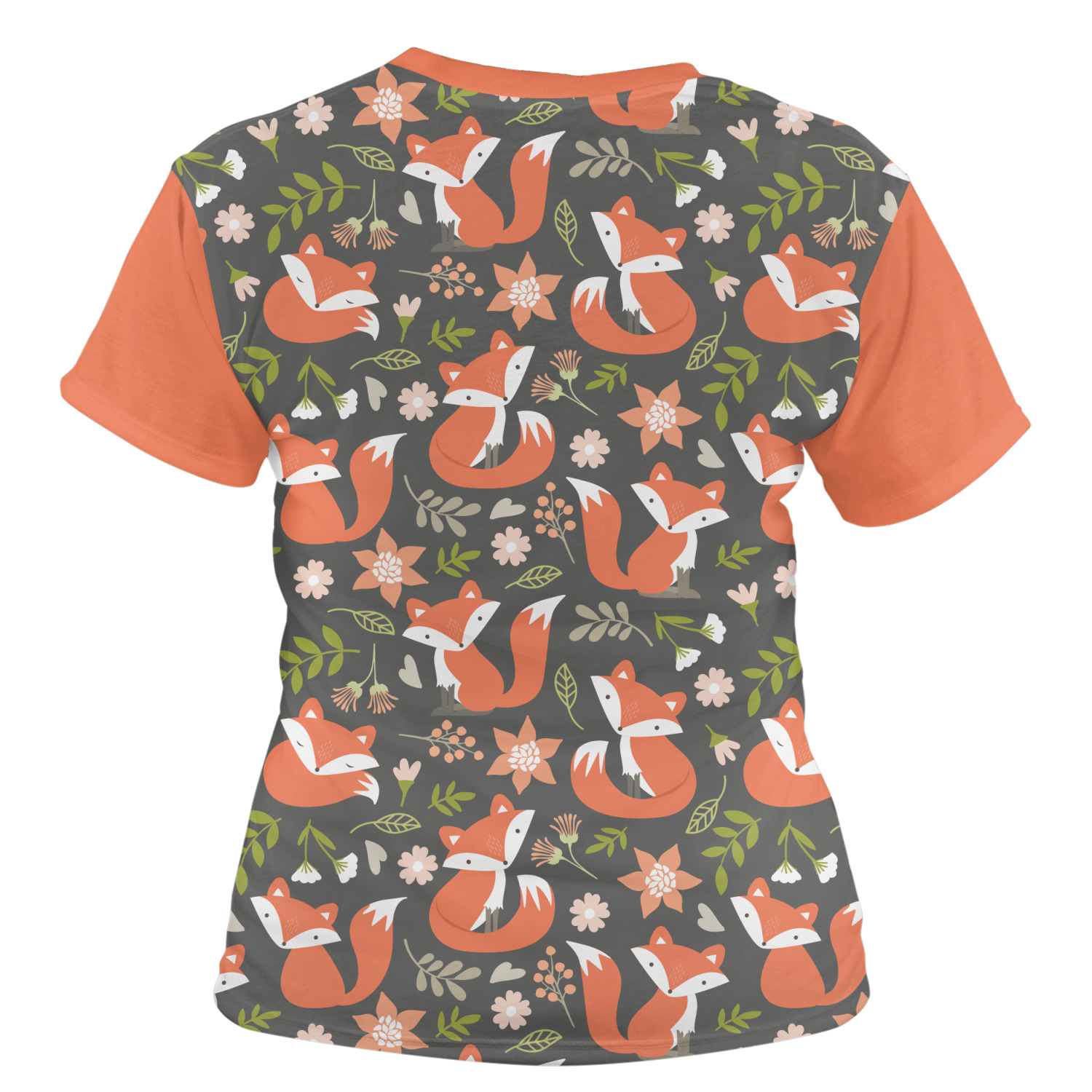 Embrace your inner woodsmen with the Fox Trail Floral design. The bottom of design features an adorable, orange fox surrounded by flowers and leaves on a gray background. On top of the design, there are abstract triangles in orange, green and gray.