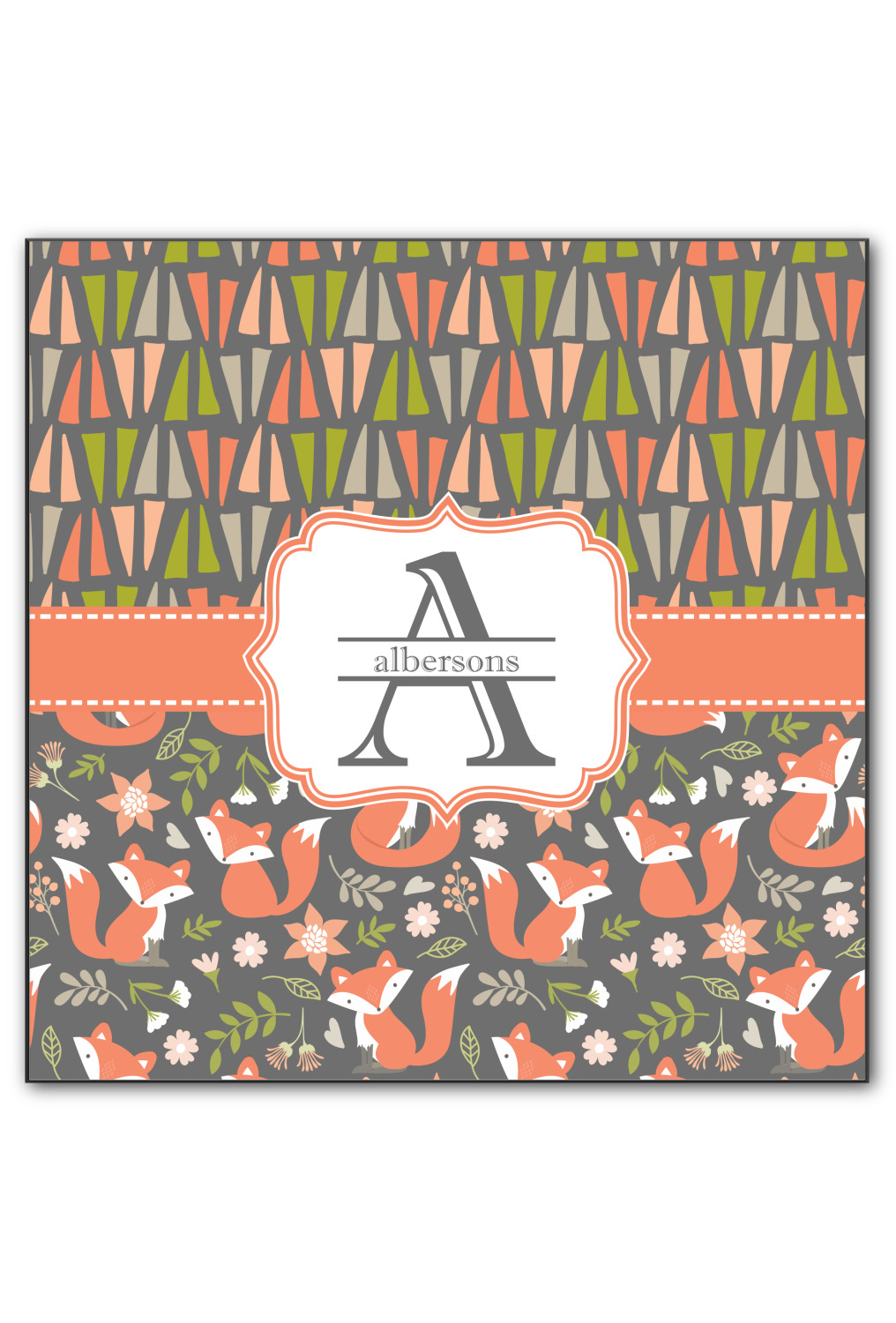 Embrace your inner woodsmen with the Fox Trail Floral design. The bottom of design features an adorable, orange fox surrounded by flowers and leaves on a gray background. On top of the design, there are abstract triangles in orange, green and gray.