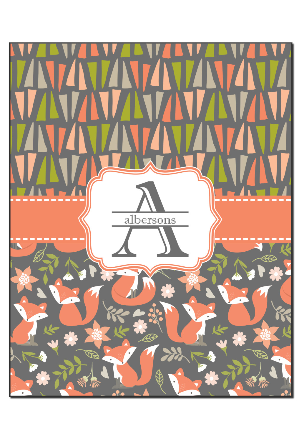 Embrace your inner woodsmen with the Fox Trail Floral design. The bottom of design features an adorable, orange fox surrounded by flowers and leaves on a gray background. On top of the design, there are abstract triangles in orange, green and gray.