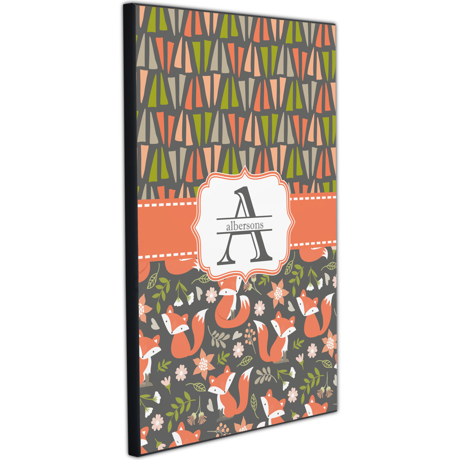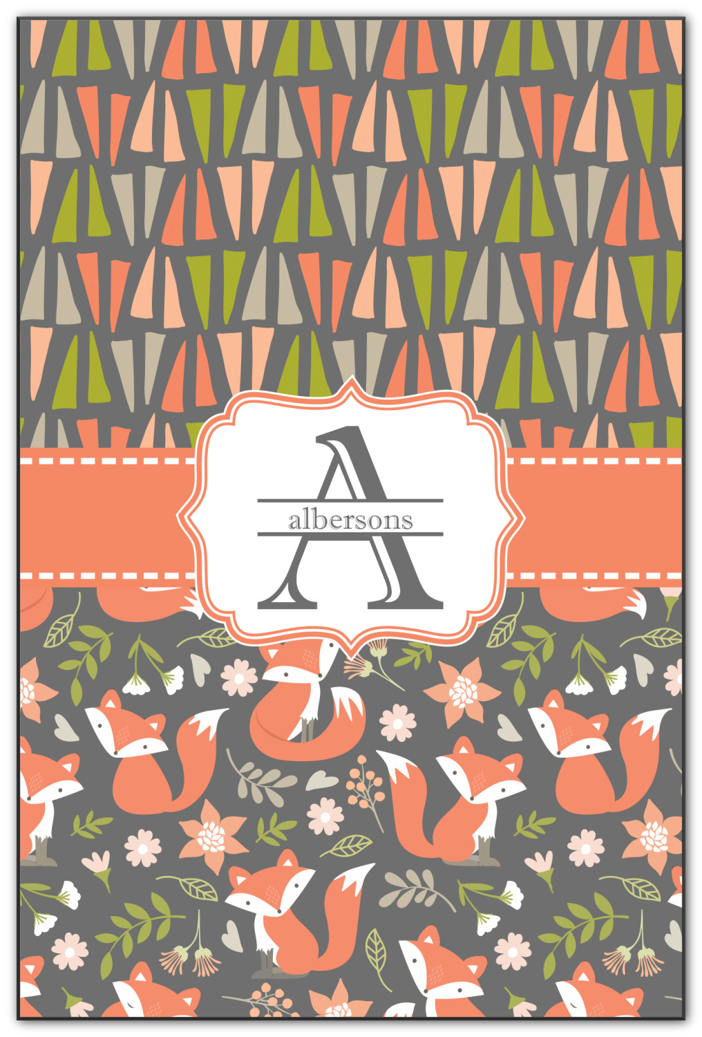 Embrace your inner woodsmen with the Fox Trail Floral design. The bottom of design features an adorable, orange fox surrounded by flowers and leaves on a gray background. On top of the design, there are abstract triangles in orange, green and gray.