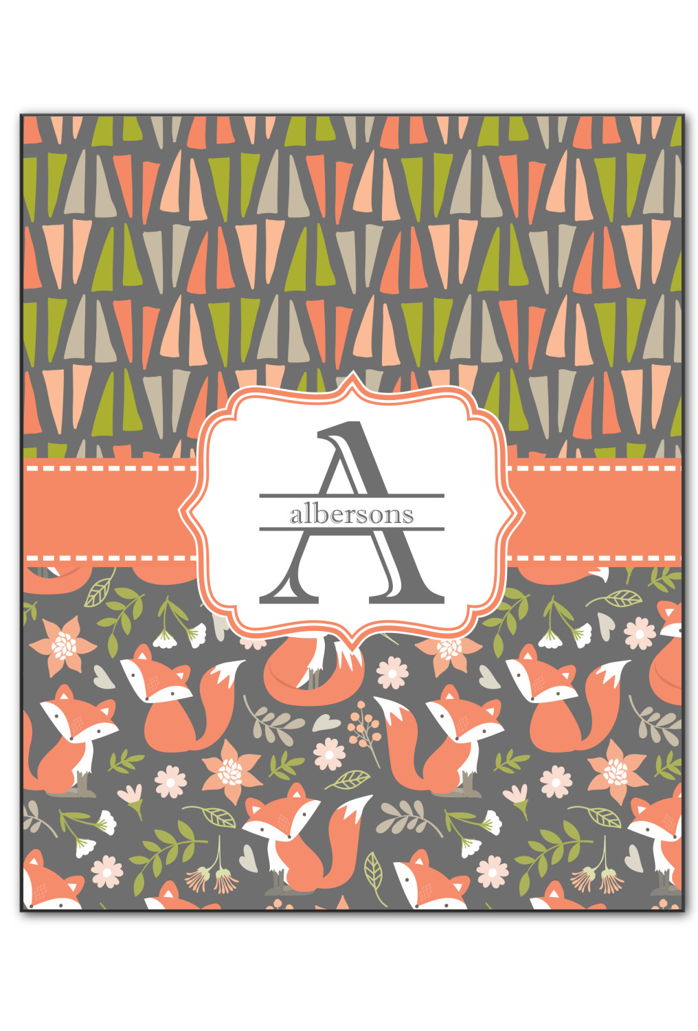 Embrace your inner woodsmen with the Fox Trail Floral design. The bottom of design features an adorable, orange fox surrounded by flowers and leaves on a gray background. On top of the design, there are abstract triangles in orange, green and gray.
