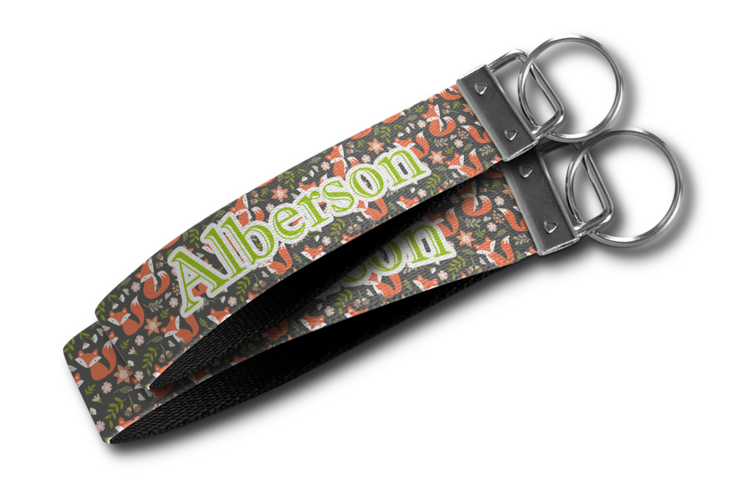 These key fob keychains are made from a polyester weave, right here in the USA. They feature a silver, metal clasp, attached to a round keyring. The piece gives the personalized wristlet a beautiful, finished look. Your customized design is printed on the outside of the keychain strap. We carry these wristlets in two sizes: small, which is 5 inches in width, and large, which is 5.5 inches in width.