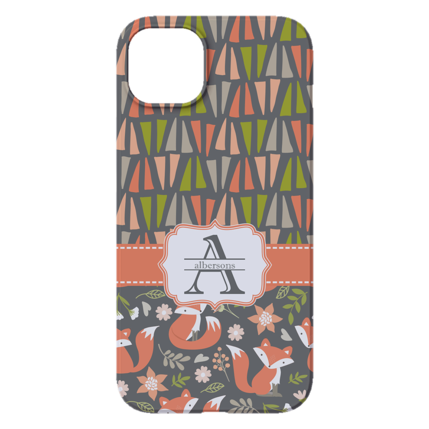 Embrace your inner woodsmen with the Fox Trail Floral design. The bottom of design features an adorable, orange fox surrounded by flowers and leaves on a gray background. On top of the design, there are abstract triangles in orange, green and gray.