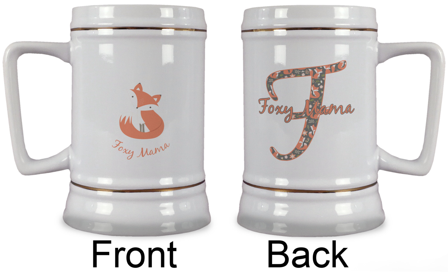 The beer steins are white in color, made from the highest quality ceramic and are approx. 5.5" tall with a top diameter of 3.5" and a bottom diameter of 4". They also have a D shaped handle that gives a modern touch to the classic European shaped beer stein. The beer steins also feature elegant gold pin stripes on the top and the bottom.