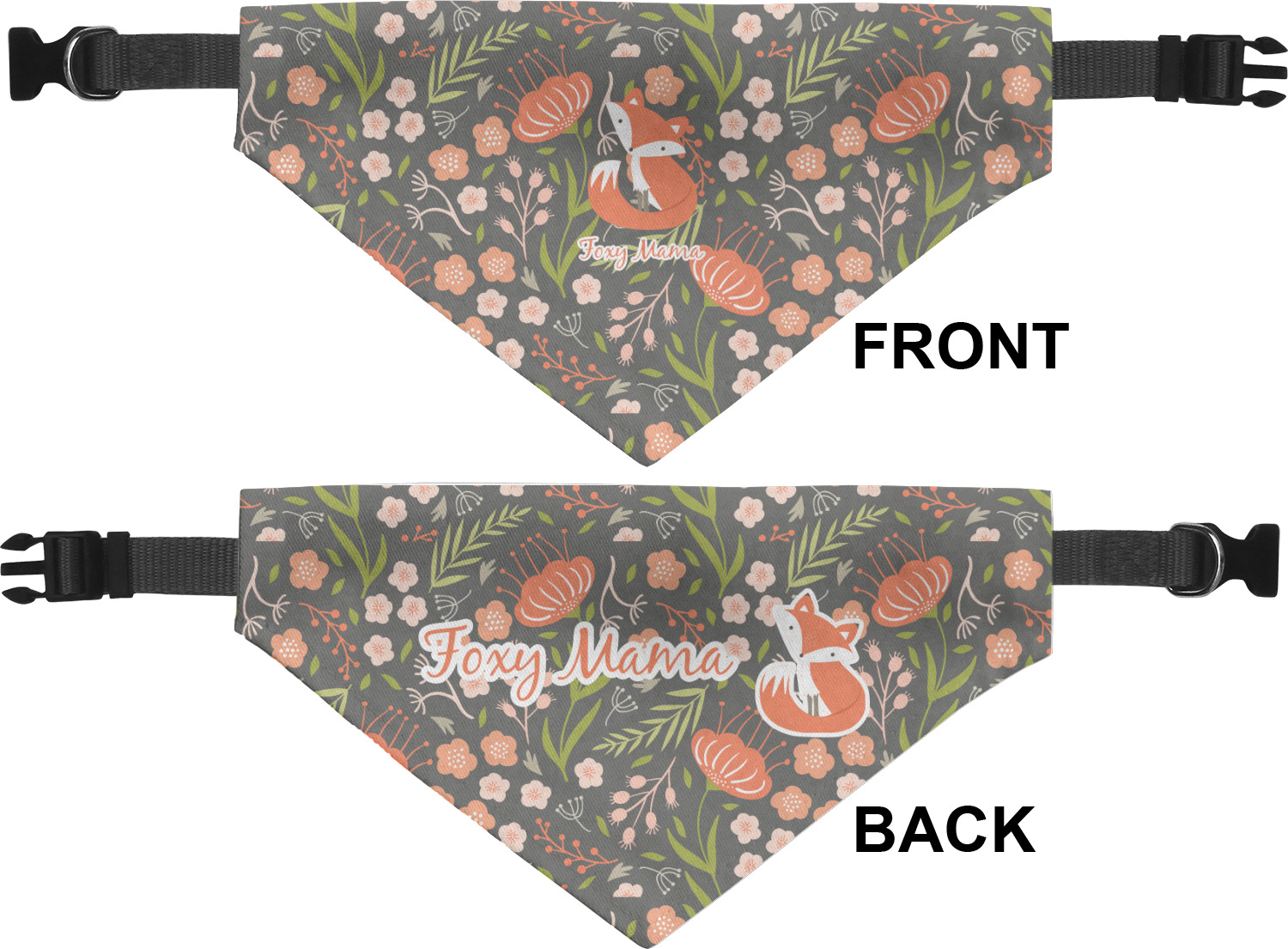 We print the front and back of these dog bandanas with your customized design. The bandana itself is made from a durable polyester, sewn together with a gap large enough to accommodate any collar. Regardless, the bandana includes a plain black, canvas collar with plastic snaps, that can easily be removed if desired. These dog bandana collars are available in four sizes: small, medium, large, and extra large. Please see our sizing chart for more information regarding the dimensions of each size.