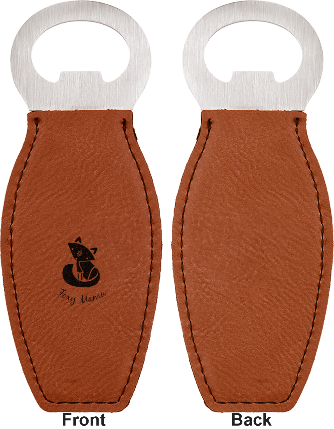 Built from stainless steel, these custom bottle openers are wrapped in a cognac-colored leatherette. Sharp, black stitching lines the edges for extra durability and a finished touch. Your personalization is laser-engraved onto the surface of this leatherette, leaving behind a crisp, black coloration. At 4.6 by 1.8 inches, this beer bottle opener gives you much of leverage when trying to open a stubborn bottle. On the opposite end of the opener, you'll find a magnet that you can use to display your new, unique bottle opener!